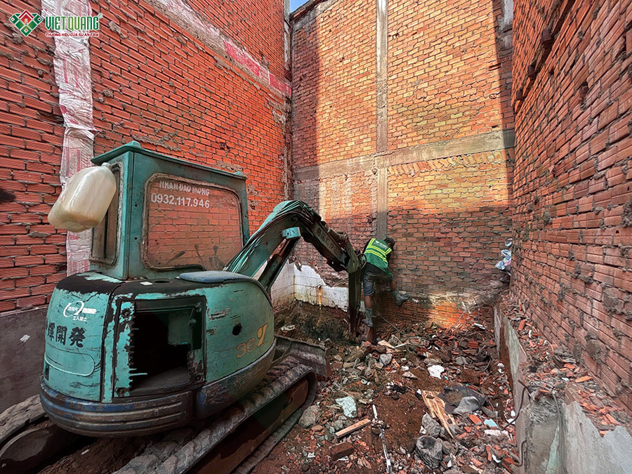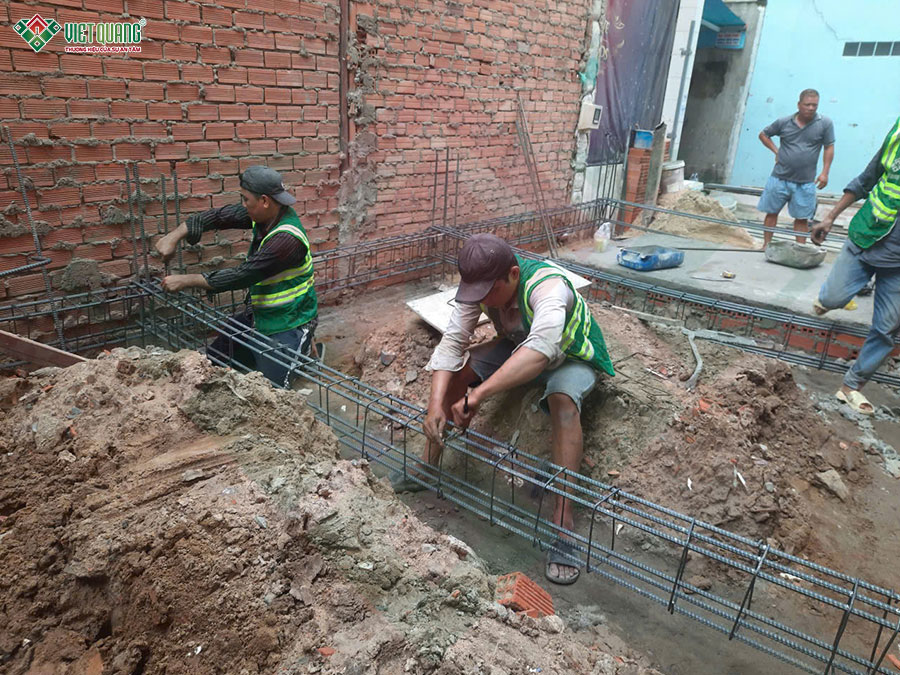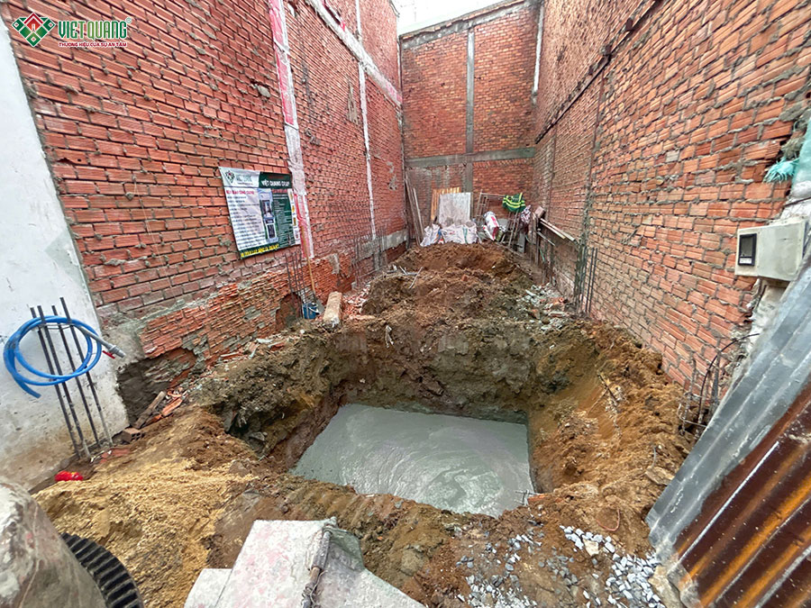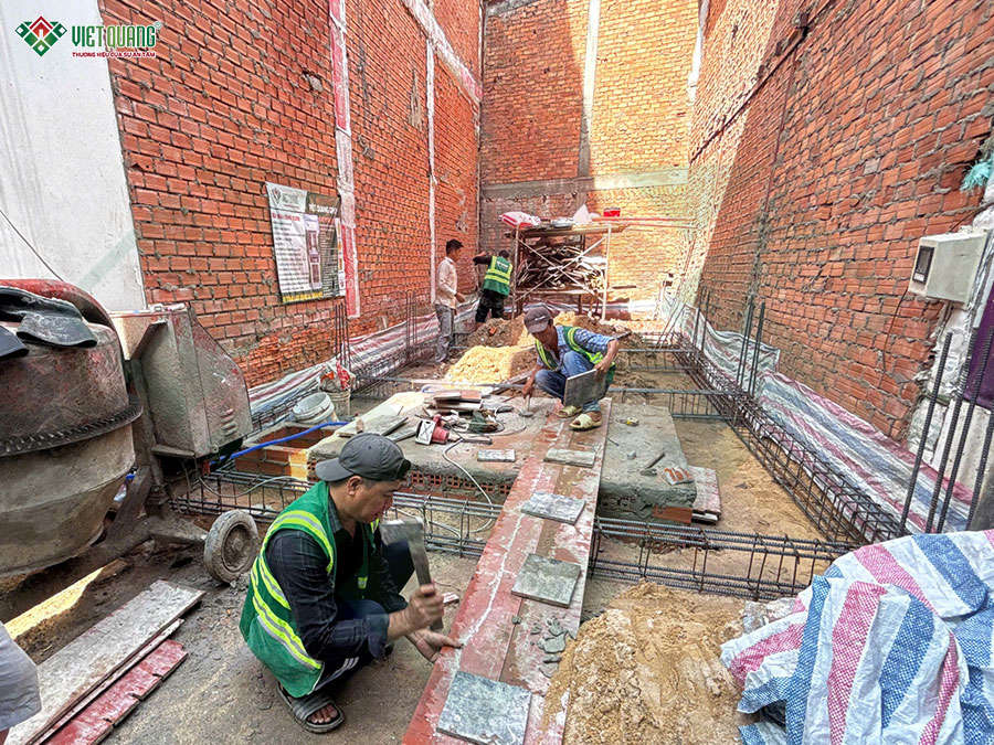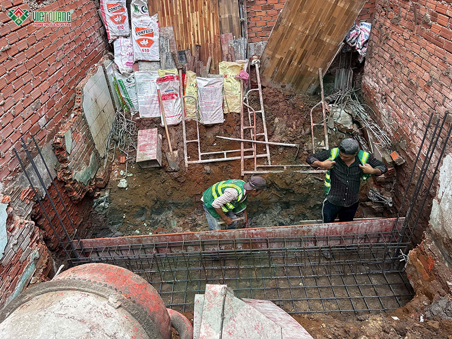 Ngay sau lễ động thổ, công trình nhà phố 2 tầng 4x12m chính thức được khởi công xây dựng. Đội ngũ kỹ sư, giám sát của Việt Quang Group tiến hành đo đạc, xác định tim móng, cao độ nền bằng thiết bị chuyên dụng. Tiếp đó quá trình đào đất, lắp đặt cốt thép, đổ bê tông móng được thực hiện tuần tự, tuân thủ nghiêm ngặt các tiêu chuẩn kỹ thuật theo TCVN.