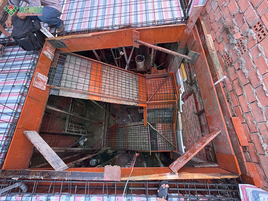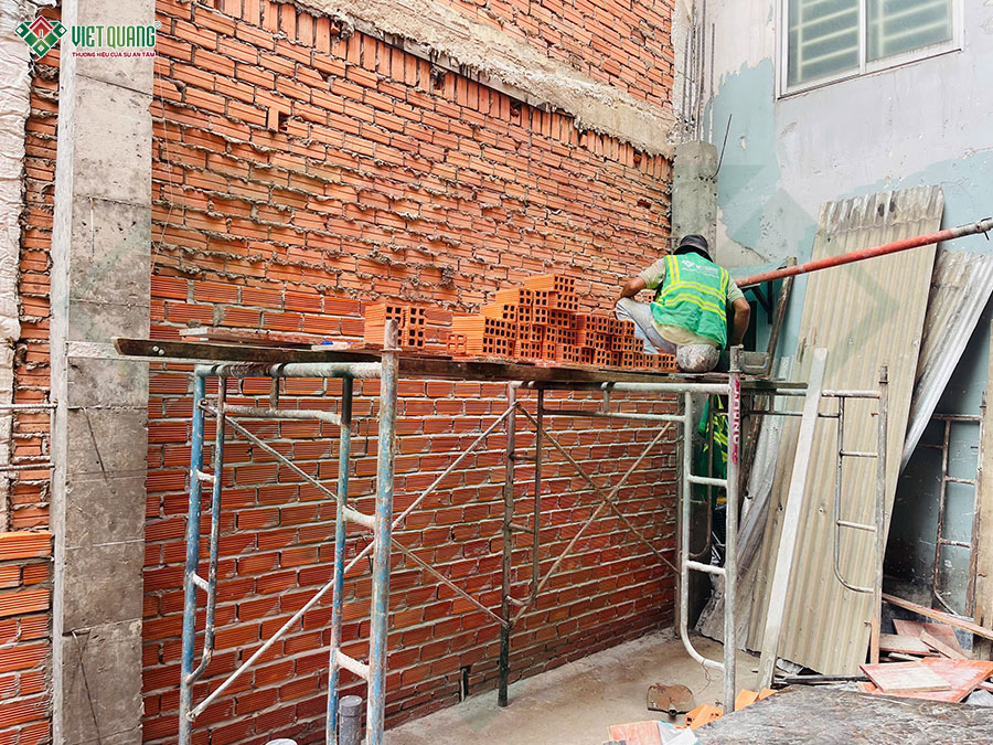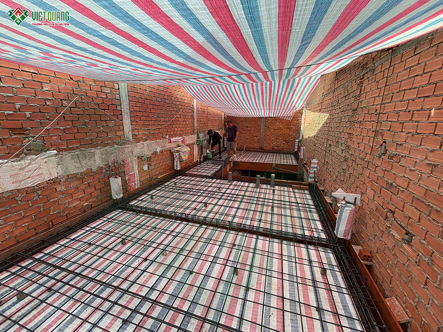 Sau khi tầng trệt được hoàn thiện, công trình tiếp tục thi công phần thô tầng 2. Giai đoạn này bao gồm việc dựng hệ thống cột, dầm, tường, sàn và cầu thang nối liền giữa các tầng. Đội ngũ kỹ sư Việt Quang giám sát sát sao để đảm bảo từng chi tiết được thi công chính xác, hạn chế tối đa sai số.