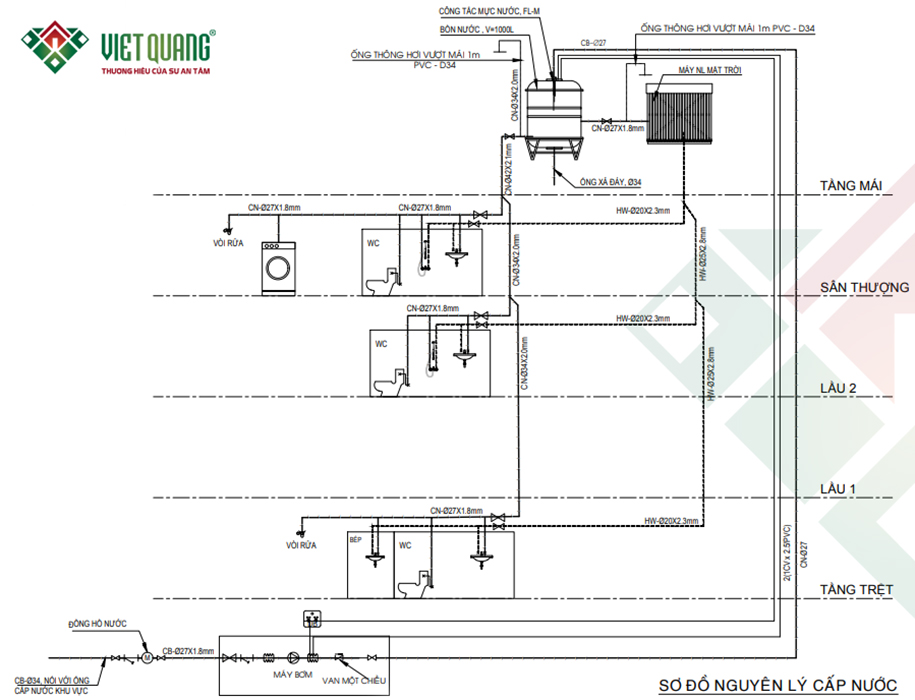 • Ống cấp nước xuống cho các tầng Ø32, đi ra từ đáy bồn nước (nơi có áp suất nước mạnh nhất), đi theo kiểu áp suất ưu tiên, ống cấp nước Ø27 vào các tầng.