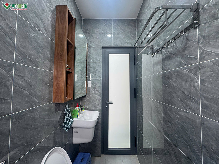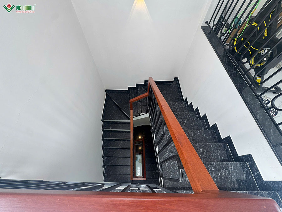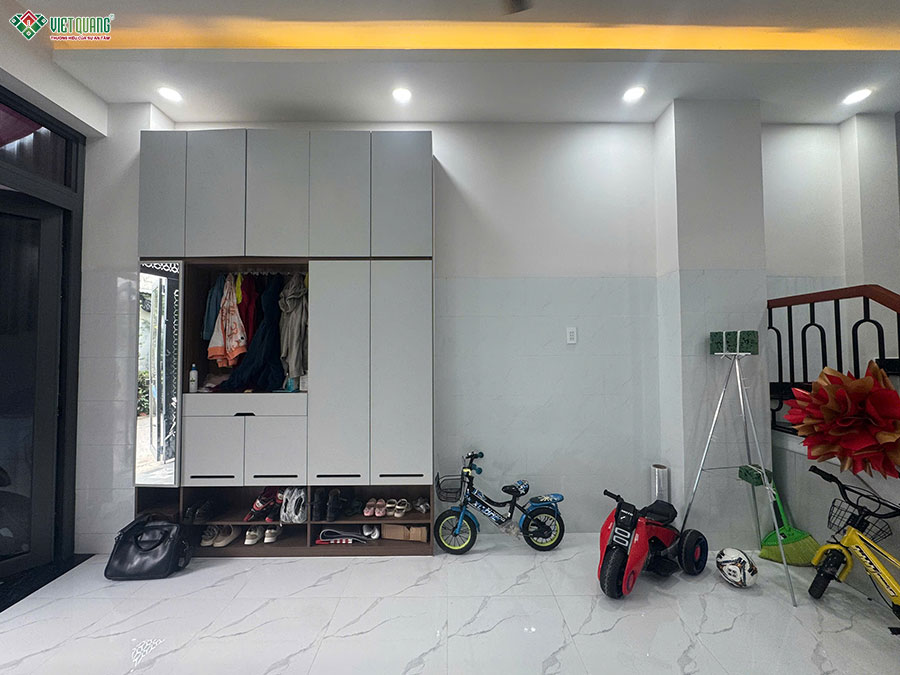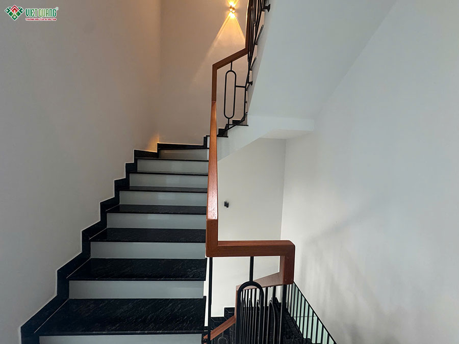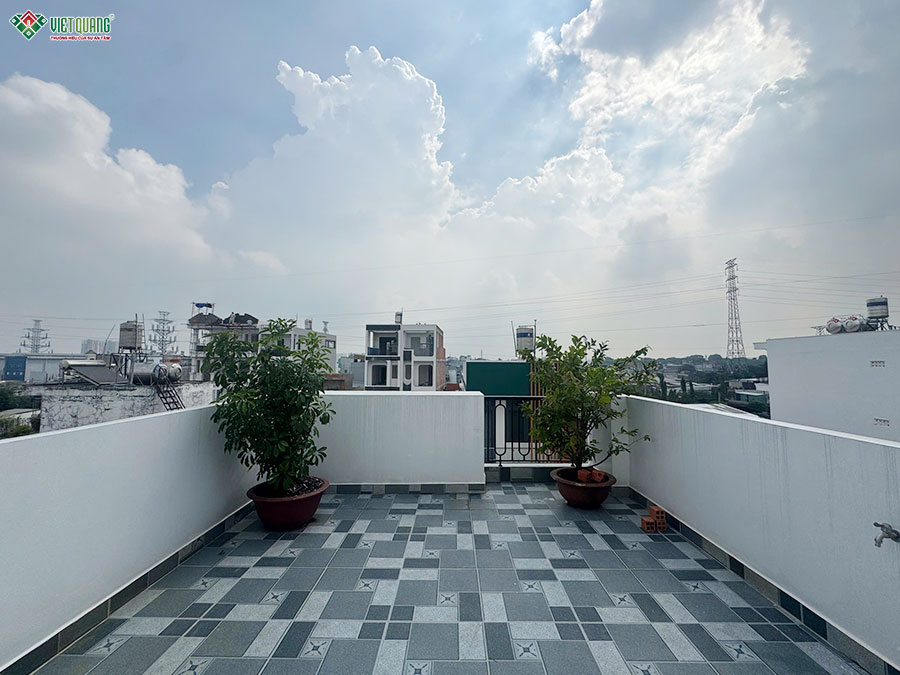 Sau khi thi công phần thô hoàn thiện và được nghiệm thu, đội ngũ Việt Quang Group tiếp tục triển khai các hạng mục thi công hoàn thiện gồm: Ốp lát gạch, sơn nước, lắp đặt hệ thống điện – nước, cửa đi, lan can, trần thạch cao và thiết bị vệ sinh. Từng công đoạn được thực hiện theo đúng quy trình kỹ thuật, đảm bảo độ bằng, độ bám dính và tính an toàn. Các vật liệu hoàn thiện được sử dụng từ các thương hiệu uy tín, đảm bảo chất lượng vừa tạo điểm nhấn thẩm mỹ cho không gian sống. Với sự giám sát 24/7 của kỹ sư công trình, ngôi nhà 1 trệt 2 lầu tum sân thượng sẽ được hoàn thiện đúng tiên độ mang đến vẻ đẹp hiện đại, sang trọng và tiện nghi, đáp ứng trọn vẹn mong muốn của gia đình anh Phúc.