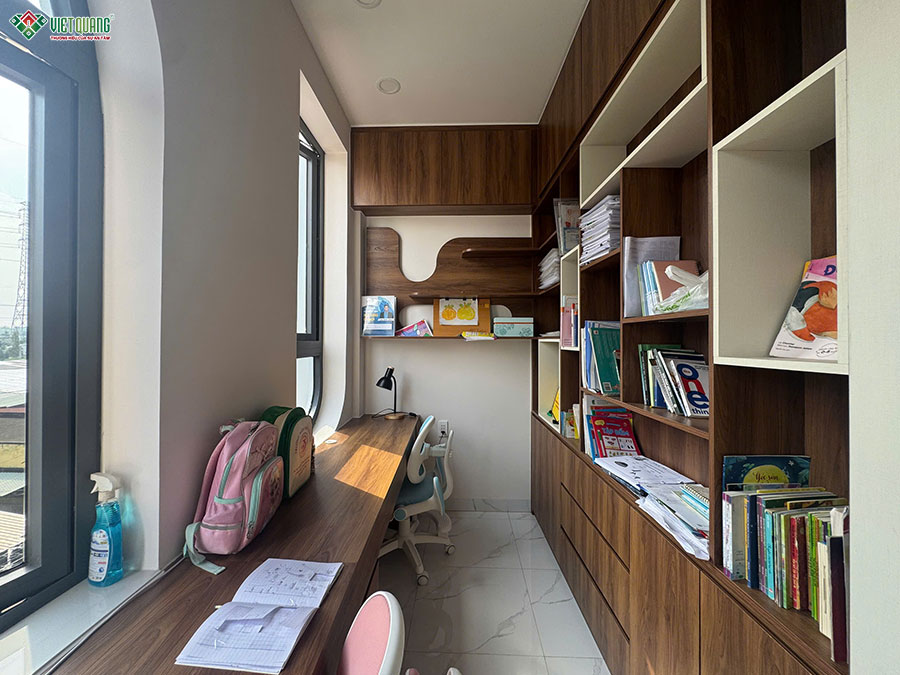 Đáp ứng nhu cầu sử dụng của gia đình, KTS Việt Quang Group bố trí thêm 02 phòng ngủ tại lầu 2, phòng học và WC ngoài hành lang. Phòng học thiết kế bên cạnh cửa sổ lớn hướng mặt tiền nhà 3 tầng, liên thông với hành lang tạo cảm giác rộng rãi hơn. Khu vực giúp các con có tinh thần thi đua, cùng nhau phấn đấu, hỗ trợ nhau cùng học tập và phát triển.