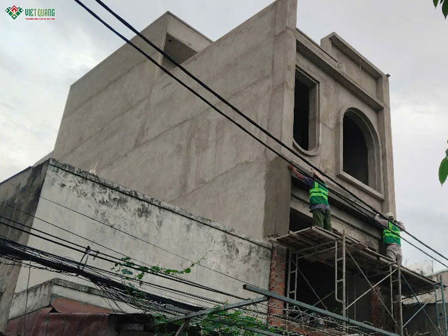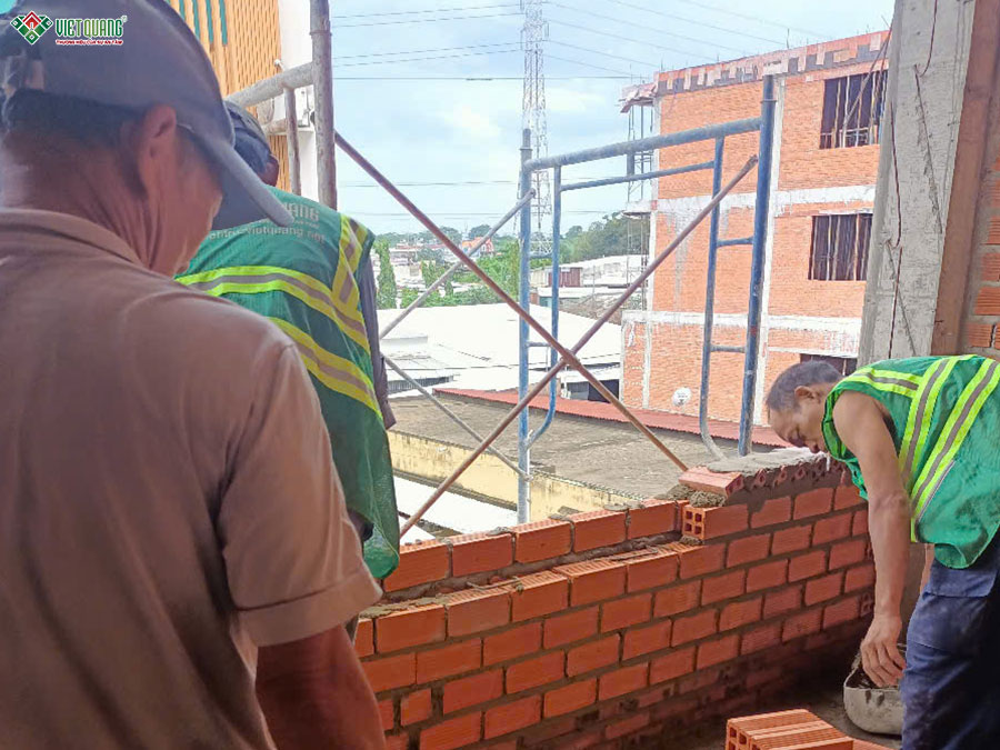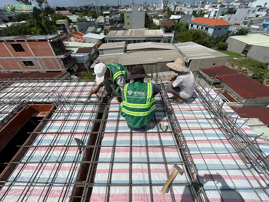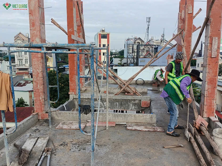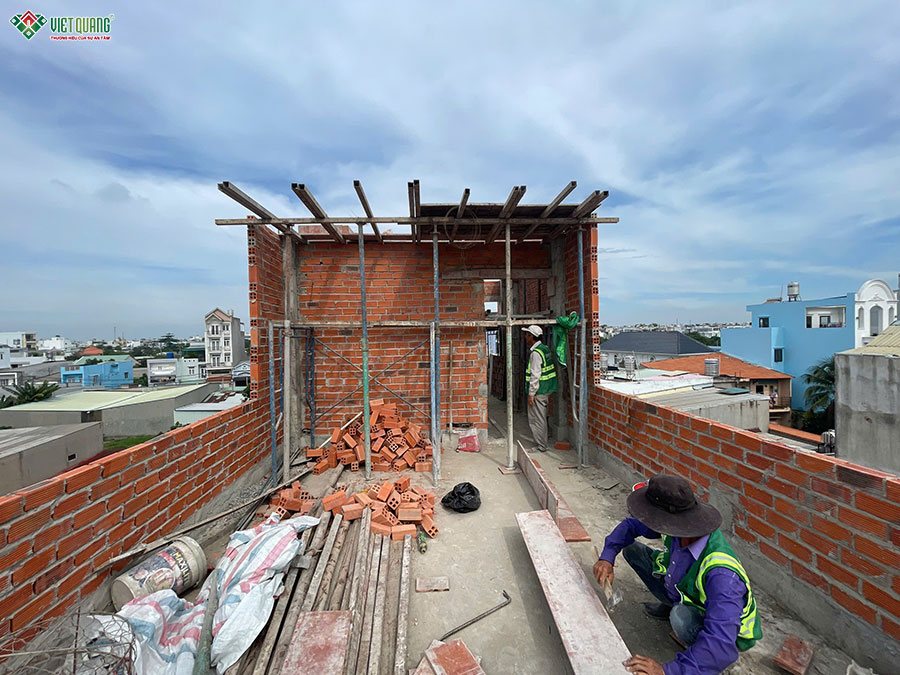 Các công việc bao gồm gia công lắp dựng cốp pha, thi công cốt thép, dựng khung xây nhà lần lượt từ tầng trệt lên đến tầng thượng. Đội ngũ thi công triển khai các hạng mục tuân thủ một số tiêu chí, chống nứt, chống thấm, chống hôi theo chuẩn xây dựng của Việt Quang Group để đảm bảo mang đến công trình chất lượng, thẩm mỹ cao, thoải mái trong quá trình sử dụng.