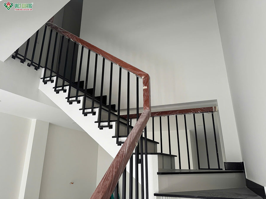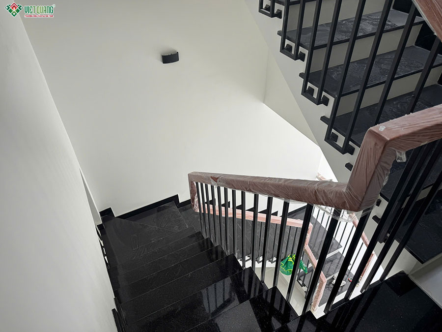 - Thi công cầu thang với kết cấu thép chắc chắn, từng bậc được căn chỉnh chuẩn thiết kế.