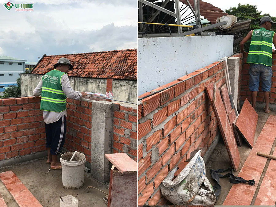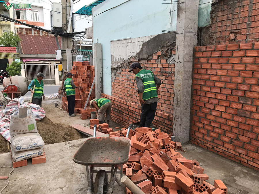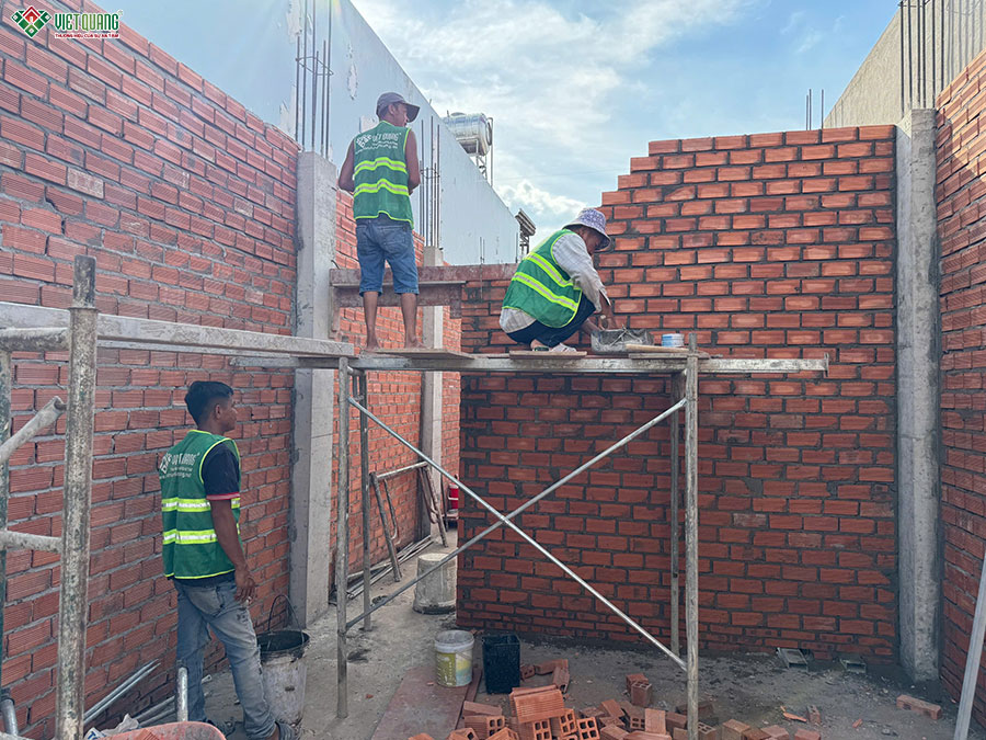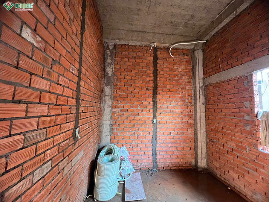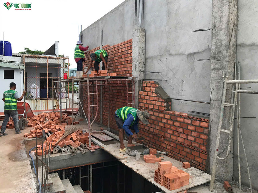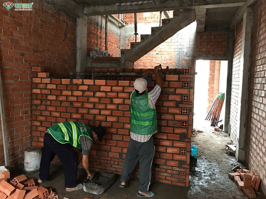 - Xây tường bao, tường ngăn phòng tầng trệt bằng gạch tiêu chuẩn, mạch vữa đều – đẹp – chắc chắn.