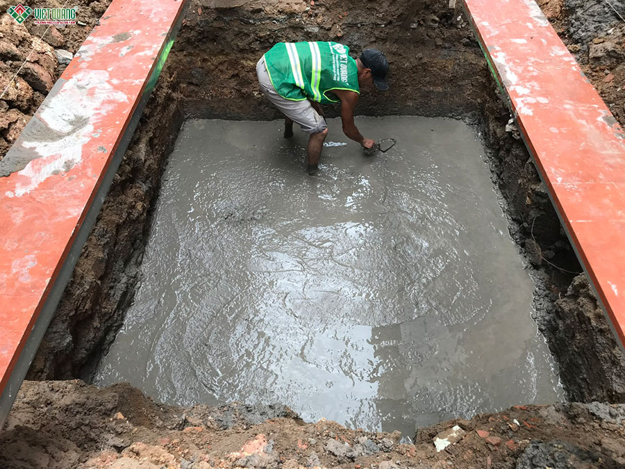 Ngay sau khi hoàn tất hồ sơ thiết kế và xin phép xây dựng, công trình nhà phố 3 tầng sân thượng của gia đình chú Đại xã Xuân Thới Sơn chính thước bước vào giai đoạn thi công móng. Nền đất tại khu vực xã Xuân Thới Sơn (Hóc Môn) được đánh giá khá mềm và yếu vì vậy đội ngũ Việt Quang Group đã triển khai phương án thi công móng cọc bê tông nhằm tăng độ ổn định, khả năng chịu tải và đảm bảo tuổi thọ cho ngôi nhà.