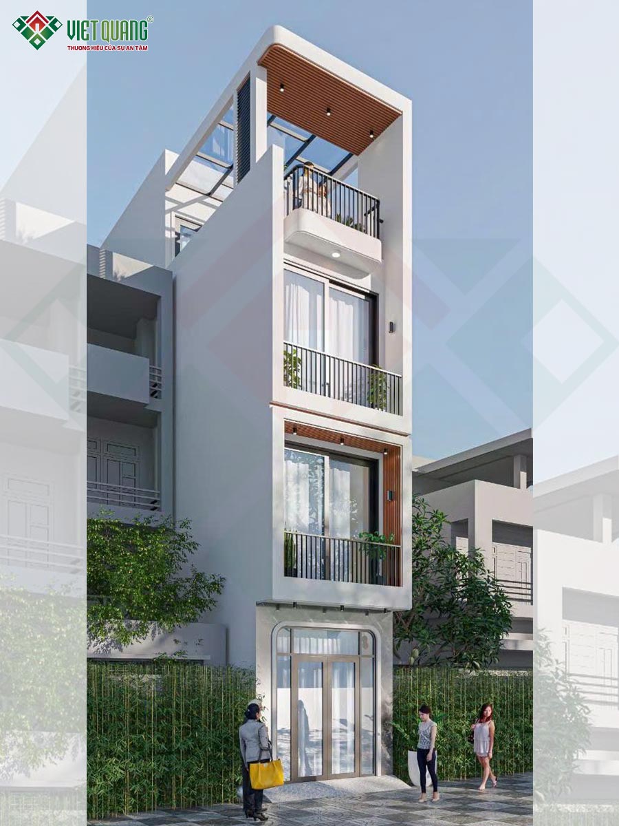 Mẫu nhà gây ấn tượng với mặt tiền tối giản – tinh tế, các mảng ban công thoáng kết hợp lam gỗ trang trí, kính lớn và cây xanh, mang đến cảm giác nhẹ nhàng, sang trọng nhưng vẫn rất gần gũi. Thiết kế tum sân thượng giúp mở rộng không gian sinh hoạt, tạo khu vực thư giãn lý tưởng cho gia đình sau những giờ làm việc bận rộn.