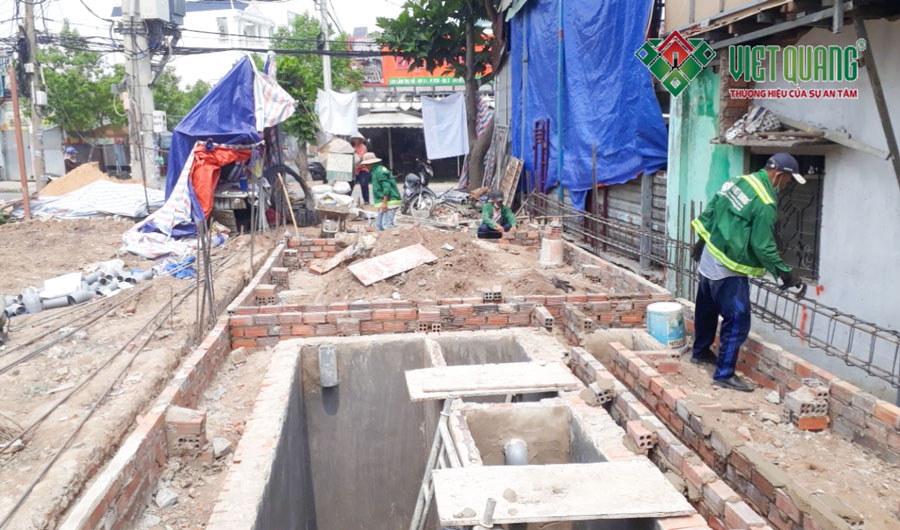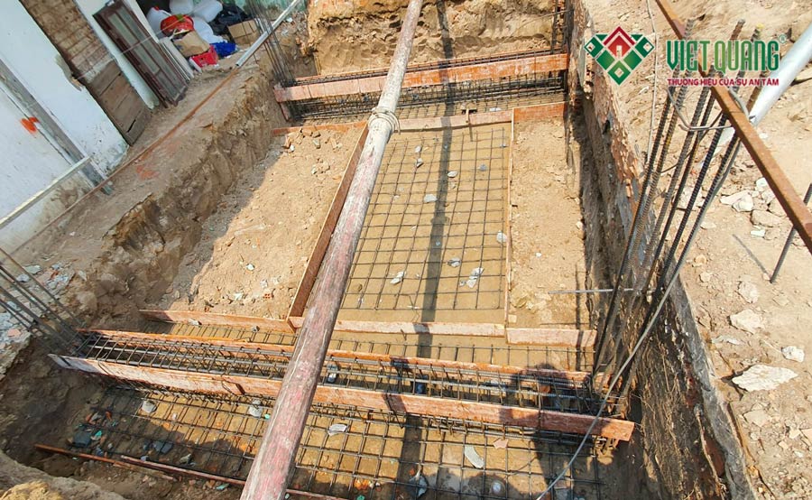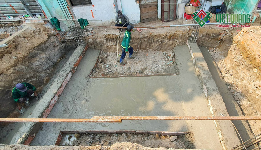 Thi công đổ bê tông móng băng và đáy bể hầm phân tự hoại công trình nhà phố 3 tầng 4.3x23m