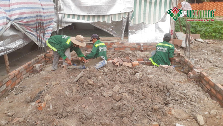 Công nhân Việt Quang đang thi công xây tường bao móng công trình nhà phố 3 tầng 4.3x23m