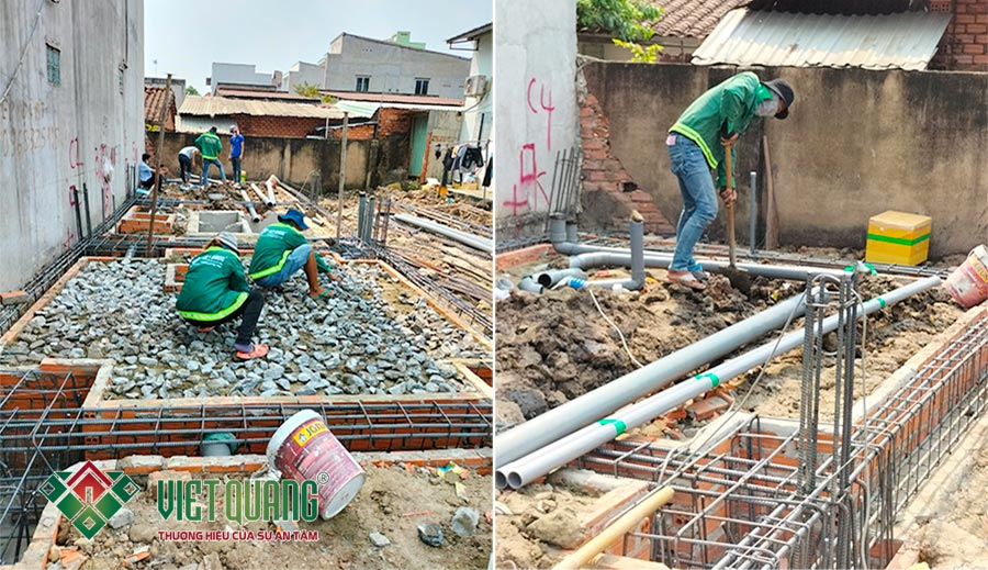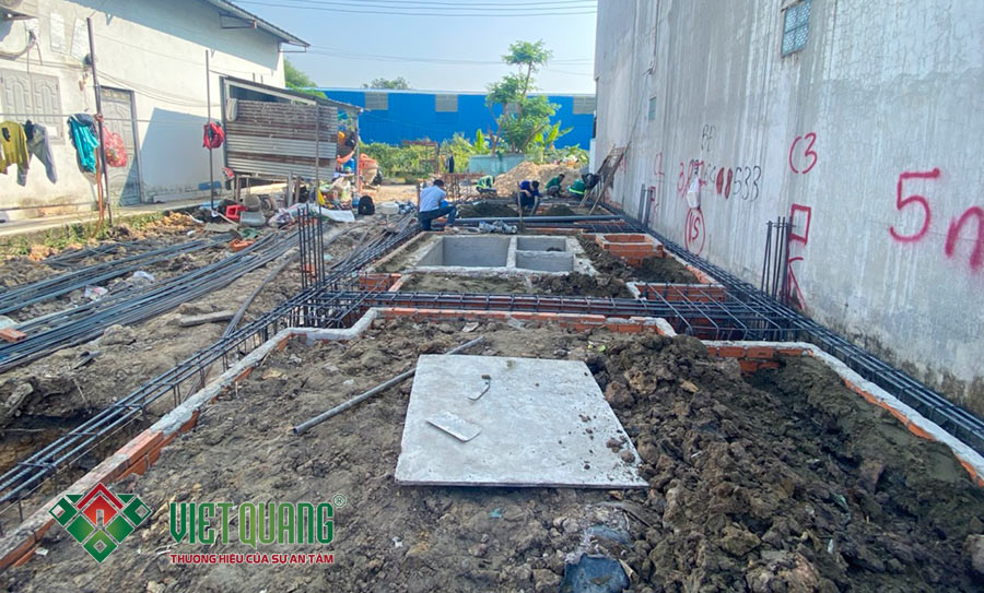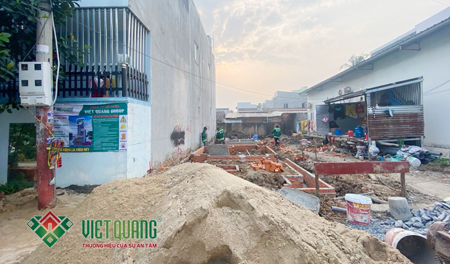 Đội ngũ công nhân Việt Quang đang thi công phần móng công trình nhà phố 4 tầng 4.2x16m tại Bình Dương