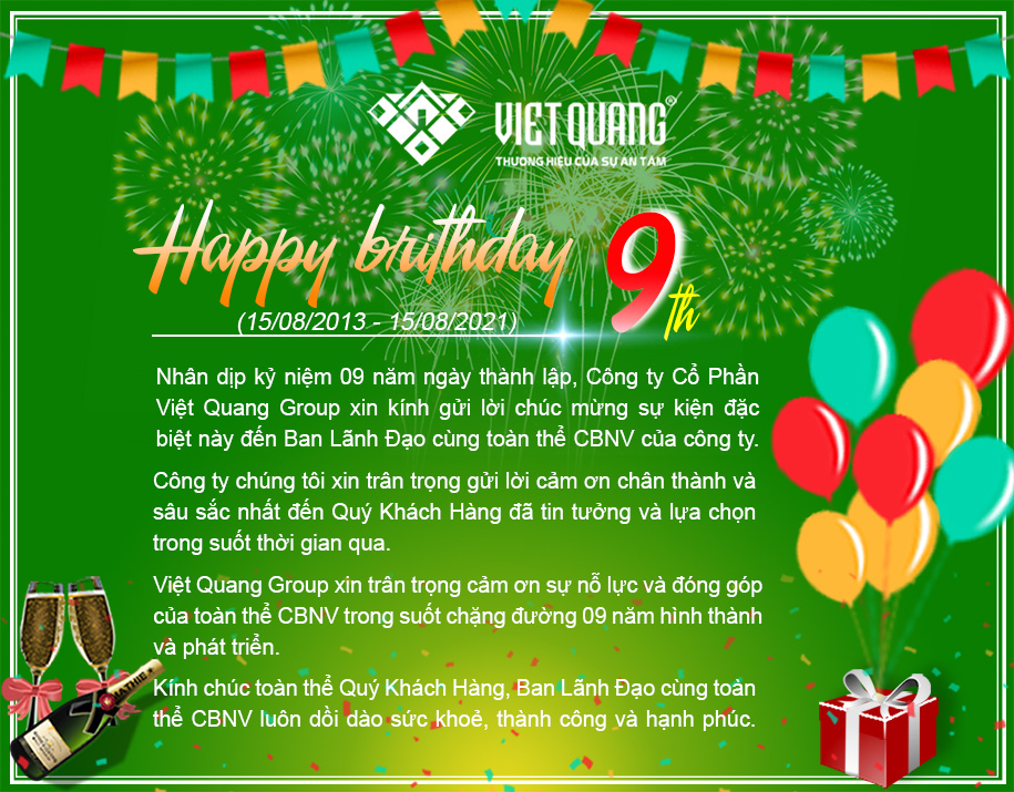 Nhân dịp kỷ niệm 09 năm ngày thành lập (15/08/2013 – 15/08/2021), Công ty Cổ Phần Việt Quang Group xin kính gửi lời chúc mừng sự kiện đặc biệt này đến Ban Lãnh Đạo cùng toàn thể CBNV của công ty.