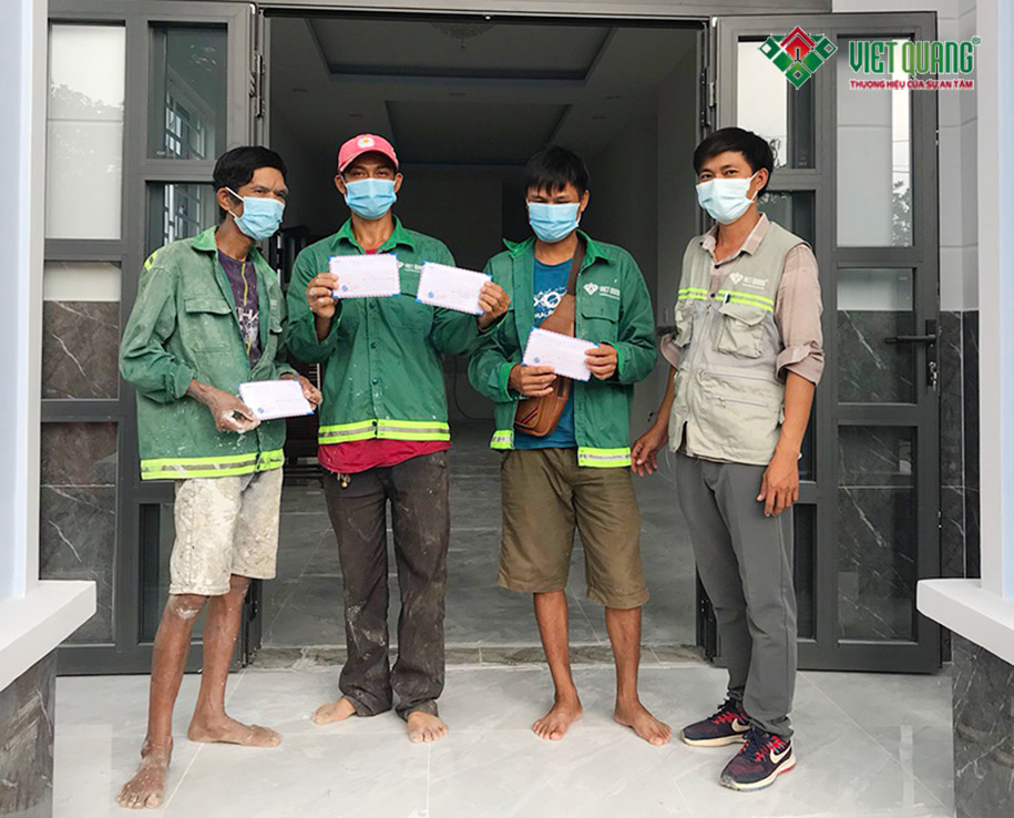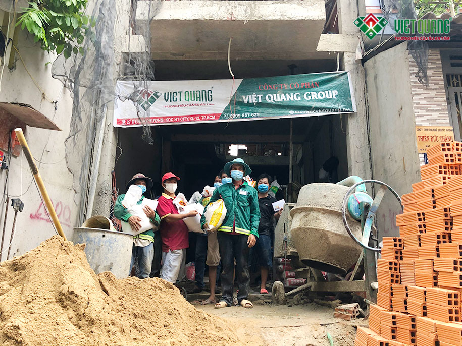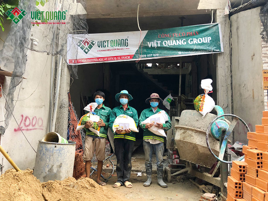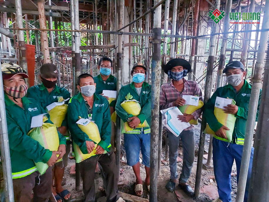 Từ ngày 11/07 – 14/07/2021, tất cả công nhân đang làm việc tại các công trình xây nhà mới hoặc sửa nhà của Việt Quang đều được tăng những nhu yếu phẩm cần thiết như: gạo, nước mắm, dầu ăn hoặc nhận bằng tiền mặt để mua sắm hoặc trang bị nhưng nhu yếu phẩm cần thiết khác cho sinh hoạt hàng ngày.