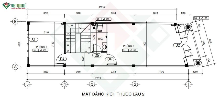 Dựa trên mặt bằng lầu 2 và lầu 3, công năng của ngôi nhà được bố trí khoa học, đáp ứng tối đa nhu cầu sinh hoạt của gia đình nhiều thế hệ. Ở lầu 2, không gian được chia thành hai phòng ngủ lớn nằm ở hai đầu nhà. Một phía trước và một phía sau đảm bảo sự riêng tư, yên tĩnh và thoáng khí nhờ hệ thống cửa sổ lấy sáng tự nhiên. Khu vực cầu thang và nhà vệ sinh WC2 được đặt ở trung tâm, giúp tối ưu diện tích và rút ngắn khoảng cách di chuyển cho mọi thành viên.