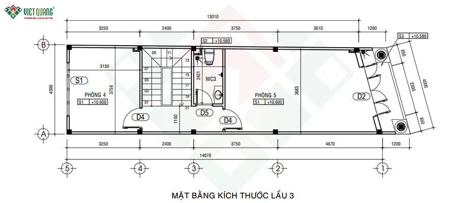 Tương tự, lầu 3 tiếp tục giữ tinh thần bố trí này với hai phòng ngủ rộng, mang lại sự đồng bộ trong thiết kế và tiện lợi trong sinh hoạt. Mỗi phòng đều có diện tích thoải mái, phù hợp bố trí nội thất như tủ áo, bàn làm việc, giường đôi… mà vẫn giữ được sự thông thoáng. WC3 được đặt giữa hai phòng, vừa kín đáo vừa thuận tiện sử dụng.