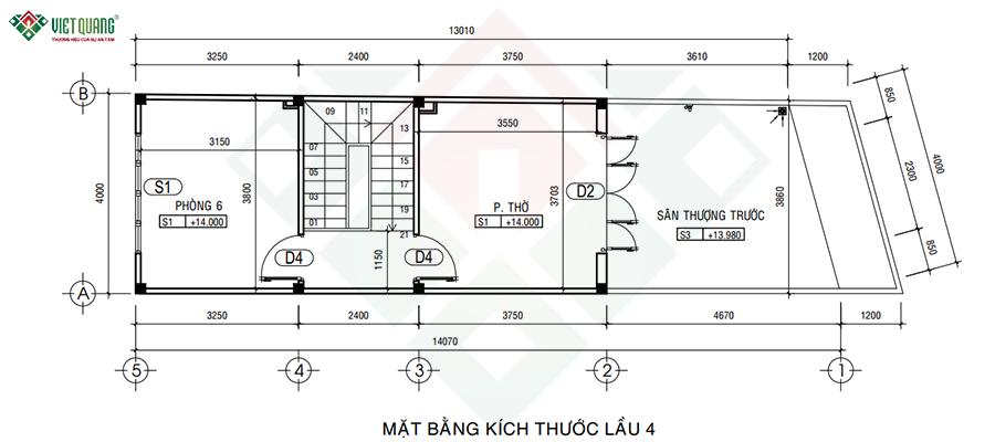 Mặt bằng công năng lầu 4 được bố trí hợp lý, đáp ứng đầy đủ nhu cầu sinh hoạt và không gian riêng tư của gia đình. Phía sau là phòng ngủ thứ 6 với diện tích rộng rãi, phù hợp cho người lớn tuổi hoặc khách lưu trú, đảm bảo sự yên tĩnh nhờ vị trí tách biệt. Khu vực cầu thang được đặt ở trung tâm nhà, tiếp tục duy trì sự liên kết mạch lạc giữa các tầng, đồng thời tối ưu lối di chuyển. Đối diện phòng ngủ là phòng thờ, không gian quan trọng nhất của tầng này. Phòng thờ được đặt giữa nhà theo đúng nguyên tắc phong thủy, đảm bảo sự trang nghiêm và thanh tịnh. Từ phòng thờ bước ra phía trước là khu vực sân thượng rộng thoáng, vô cùng lý tưởng cho các hoạt động ngoài trời như trồng cây xanh, bố trí tiểu cảnh, làm nơi thư giãn hoặc tổ chức tiệc nhỏ cho gia đình.