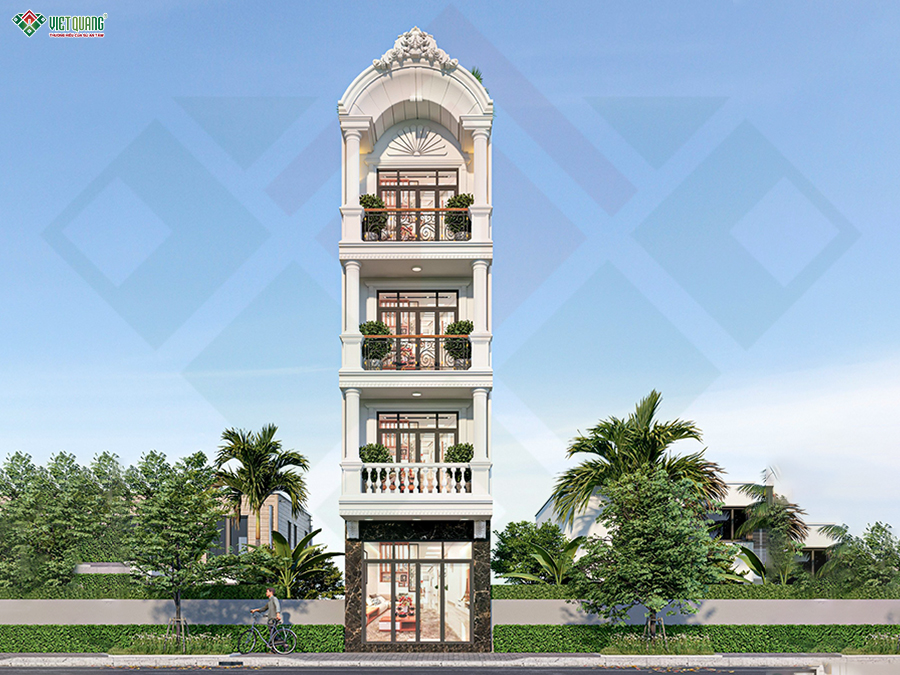 Mẫu nhà 5 tầng tân cổ điển 4x16m được xem là giải pháp tối ưu cho các gia đình muốn vừa ở vừa kinh doanh nhờ sự linh hoạt và tiện ích vượt trội trong thiết kế. Tầng trệt được bố trí dành riêng cho hoạt động kinh doanh, trong khi các tầng trên là không gian sinh hoạt khép kín, giúp gia chủ tiết kiệm đáng kể chi phí thuê mặt bằng và tạo nguồn thu ổn định lâu dài. Bên cạnh đó, kiến trúc tân cổ điển với mặt tiền sang trọng, đường nét chỉn chu tạo nên hình ảnh chuyên nghiệp, dễ dàng gây ấn tượng và thu hút khách hàng, góp phần tăng uy tín cho cửa hàng hay dịch vụ kinh doanh.