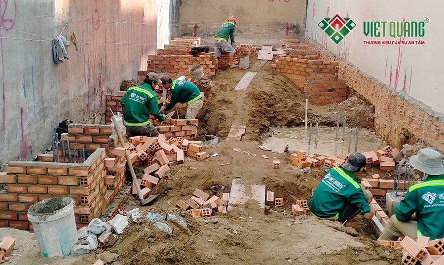 - Xây dựng tường bao móng theo hình dáng, kích thước hố móng theo thiết kế (xây tường gạch cháy thay cho coffa ván)
