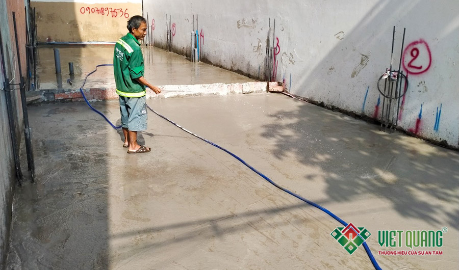 - Dùng nước rửa sạch và tạo đổ ẩm cho móng, hòa nước xi măng với nước tưới vào các vị trí đầu cọc bê tông, hố móng, giằng móng để tăng tính liên kết bê tông.