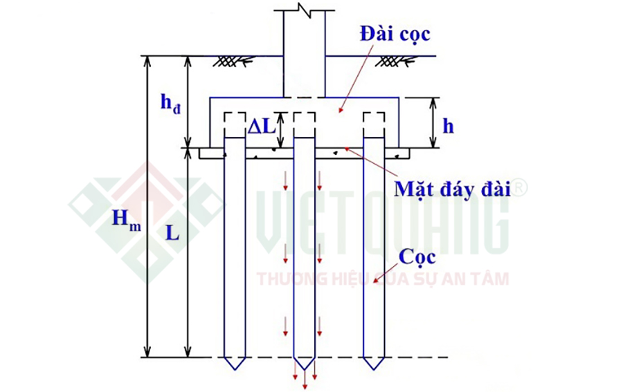 Phần cọc: Có thể làm bằng bê tông cốt thép, cừ tràm, cọc thép…Được đóng hoặc ép xuống lòng đất bằng các loại máy móc chuyên dụng. Dưới tác dụng của lực ép từ mũi cọc, các lớp đất sẽ được nén lại với nhau, làm cho nền đất dưới móng được chắc chắn hơn.