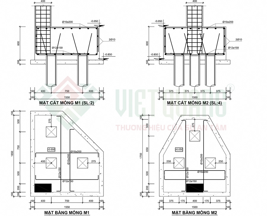- Chiều cao đài móng từ 700-800mm. Thép lồng móng cọc là thép Việt Nhật fi 10 – 14. Thép giằng móng thường sử dụng fi 16 – 20 tùy thuộc công trình khác nhau sẽ có phương án thiết kế khác nhau.