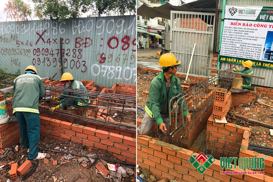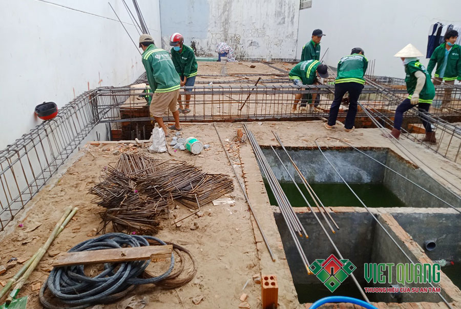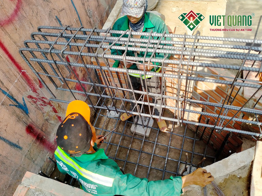 Công nhân Việt Quang đang thi công lắp đặt thép móng và giằng móng công trình nhà phố 5 tầng tại quận 7