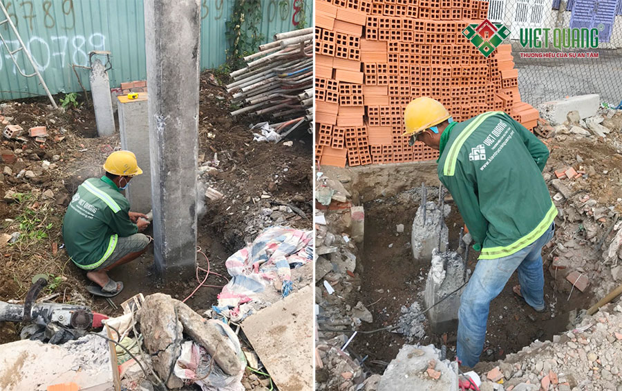 - Xác định cao độ đáy móng. Cắt và đập đầu cọc bê tông, chưa thép đầu cọc đúng thiết kế.