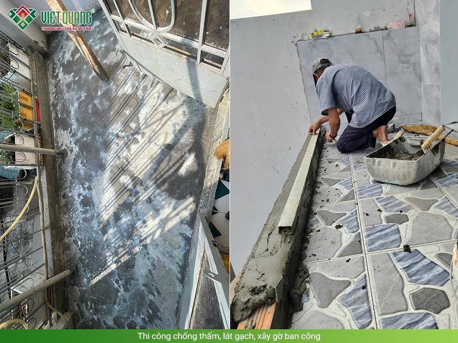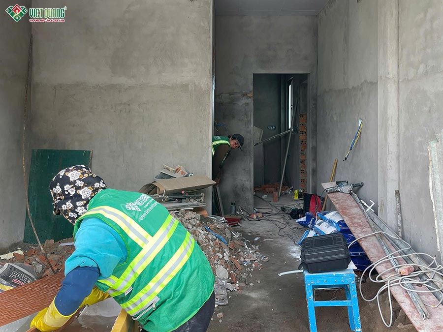 Hoàn tất thi công xây dựng phần thô nâng tầng và các hạng mục cần sửa chữa, công trình nhà a Quang bước sang giai đoạn thi công hoàn thiện, giai đoạn thể hiện nhất những thay đổi diện mạo ngôi nhà. Đội ngũ thợ Việt Quang Group tiến hành thi công ốp lát gạch sàn, gạch tưởng, sơn nước nội ngoại thất, xử lý chống thấm, đi hệ thống điện nước âm tường, lắp đặt cửa lan can, thiết bị vệ sinh và các hạng mục hoàn thiện khác. Trong suốt quá trình thi công hoàn thiện, mọi vật tư sử dụng đều được kiểm soát chặt chẽ về chủng loại, chất lượng theo đúng hợp đồng đã ký và mong muốn của gia chủ.