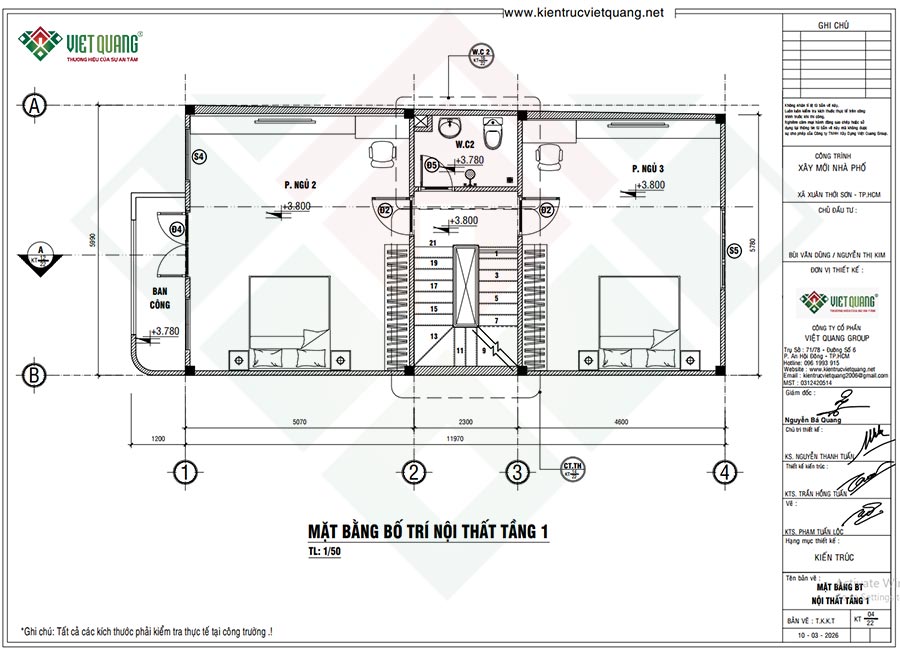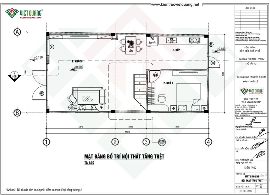 Dựa trên đặc điểm khu đất và yêu cầu thực tế, Việt Quang Group lên thiết kế chú trọng vào việc tận dụng tối đa ánh sáng tự nhiên, thông gió giúp không gian thoáng mát, giảm phụ thuộc vào các thiết bị điện. Phương án bố trí công năng khoa học phù hợp với gia đình nhiều thế hệ, cụ thể: