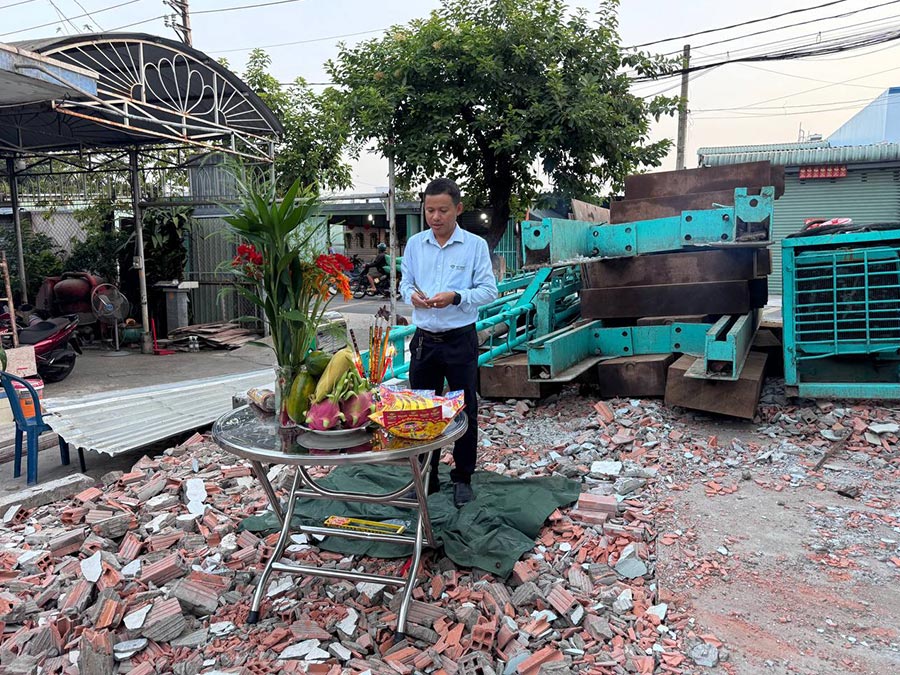 Hoàn tất toàn bộ thủ tục pháp lý theo đúng quy định, Giám đốc khối Việt Quang Group cùng gia đình anh Dũng đã tiến hành lễ cúng khởi công (động thổ) nhằm đánh dấu thời điểm chính thức bắt đầu xây dựng công trình. Buổi lễ được tổ chức trang trọng, thể hiện sự chuẩn bị chu đáo và mong muốn quá trình thi công diễn ra thuận lợi, suôn sẻ.