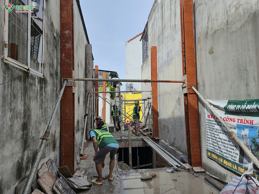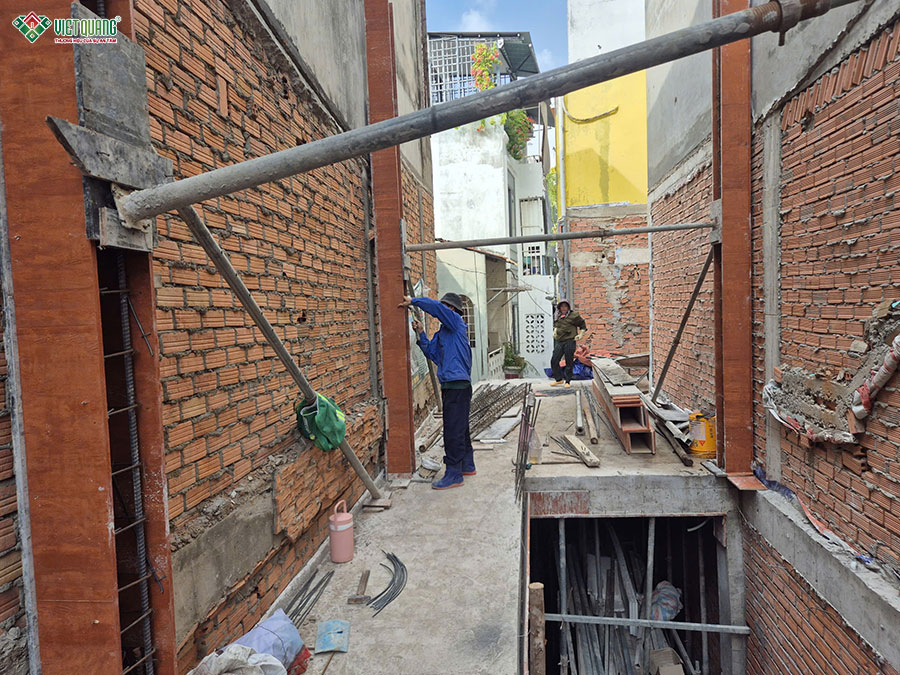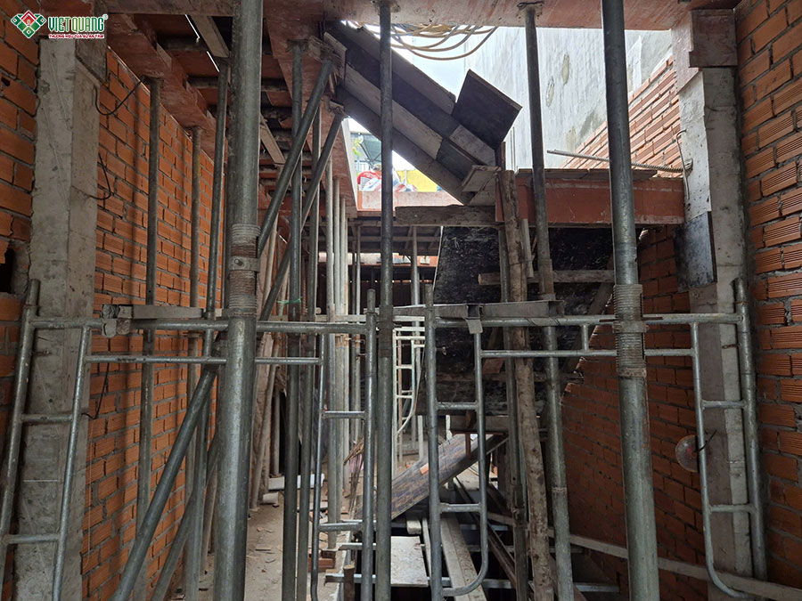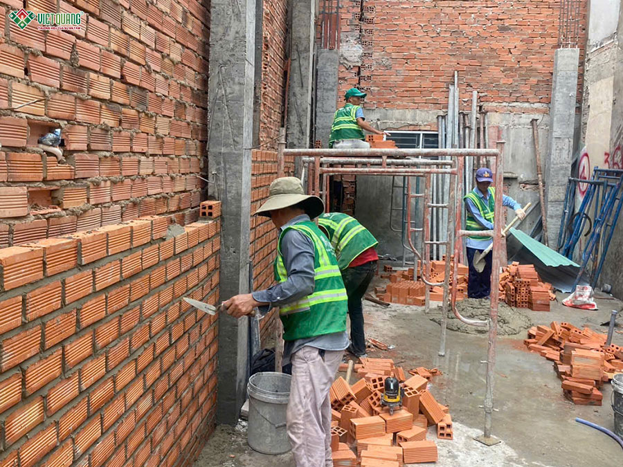 Ngay sau khi kết thúc các công việc thi công móng, đội ngũ nhân công xây dựng Việt Quang Group tiếp tục triển khi thi công xây dựng phần thô tầng trệt với các hạng mục gồm: Dựng cột trụ, xây tường gạch, thi công bê tông cốt thép sàn và cầu thang bộ dẫn lên tầng 2. Tất cả các công tác được thực hiện lặp lại tuần tự cho đến khi hoàn thành 3 tầng.
