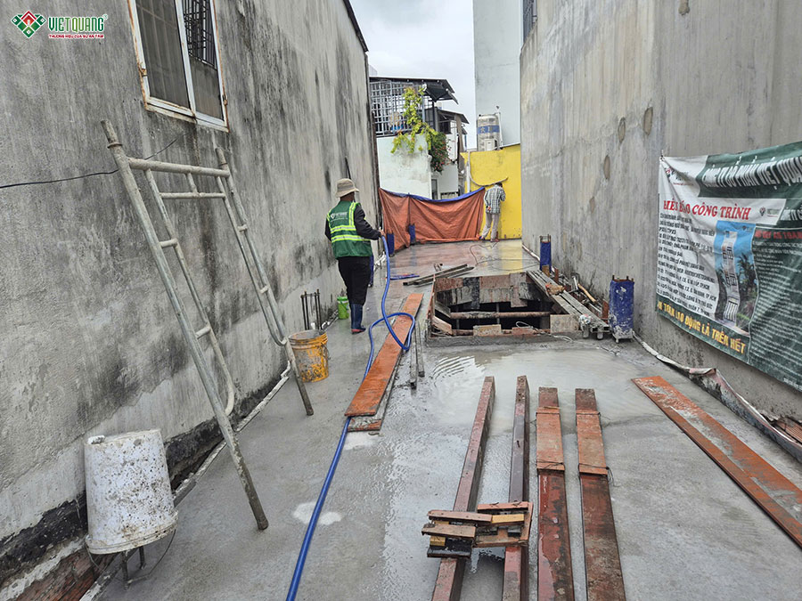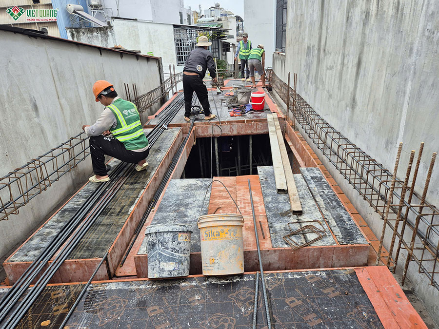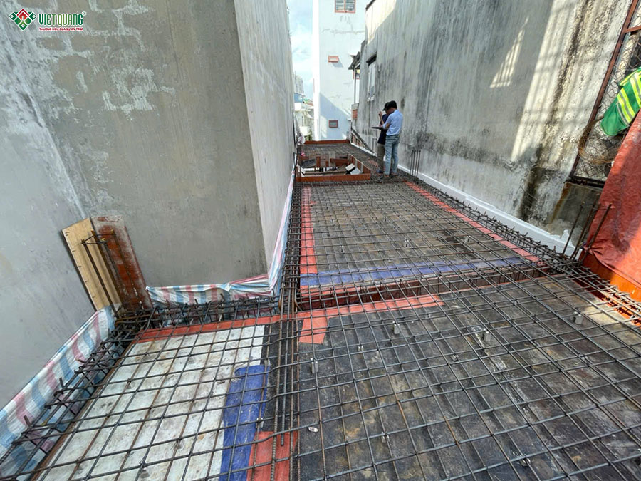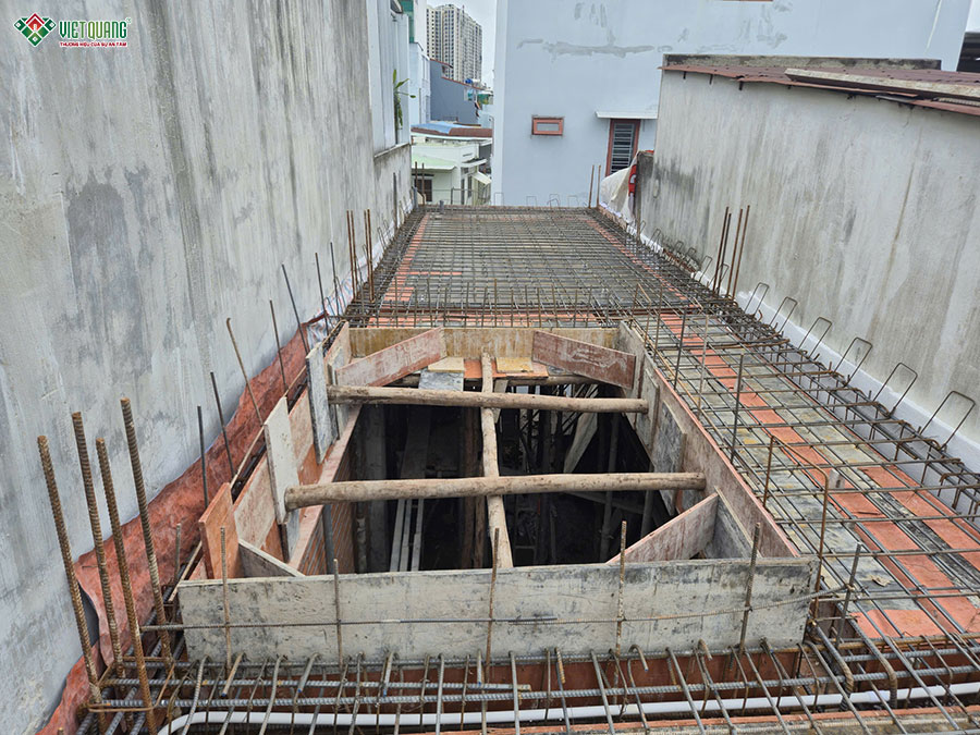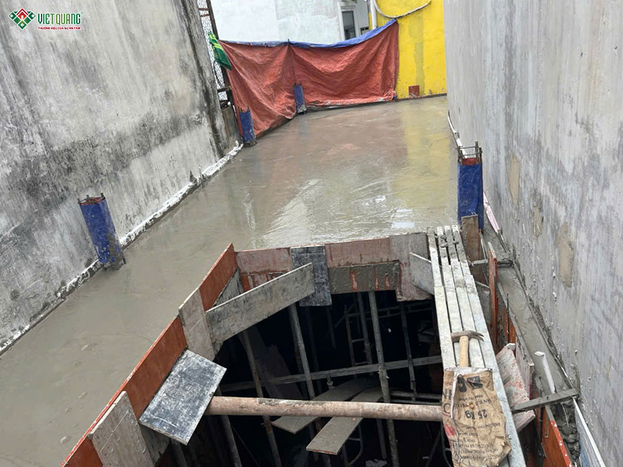 Giai đoạn thi công phần thô tầng trệt đóng vai trò then chốt, là nền tảng chịu lực chính cho toàn bộ kết cấu ngôi nhà 3 tầng sân thượng. Đội ngũ Việt Quang Group bắt đầu bằng việc định vị tim trục, lắp dựng cốp pha cột, dầm và hệ thống sàn theo đúng bản vẽ thiết kế. Tiếp đó, thép được gia công lắp đặt cẩn thận, đảm bảo đúng tiêu chuẩn về số lượng, khoảng cách và lớp bê tông bảo vệ. Sau khi hoàn thiện công tác cốp pha và cốt thép, sàn bê tông tầng trệt được đổ bằng bê tông tươi chất lượng cao, được đầm kỹ, kiểm soát độ phẳng và dưỡng hộ đúng quy trình.