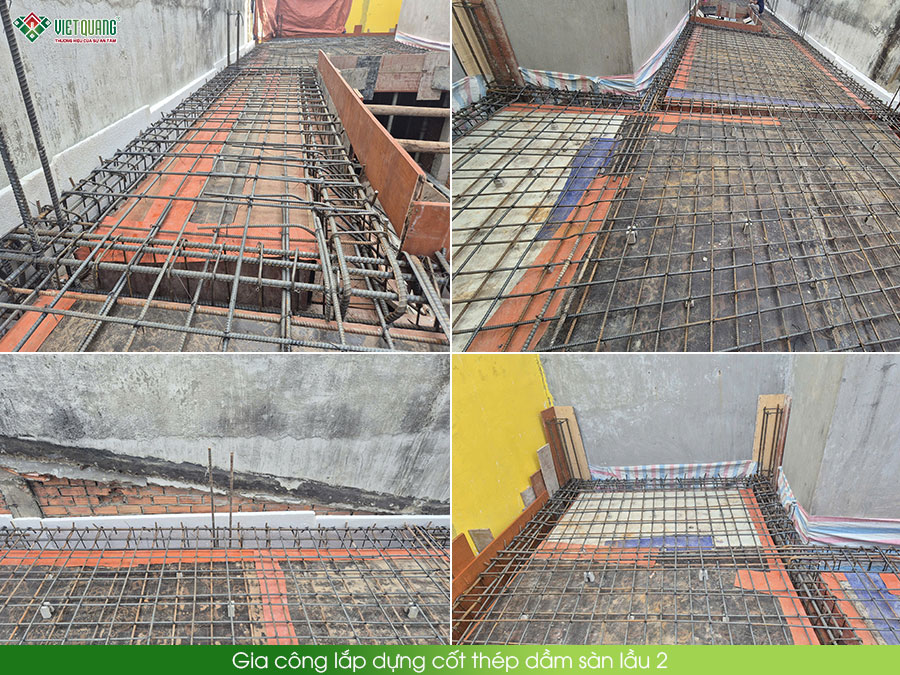 Tiếp nối quá trình xây dựng nhà ở 3 tầng sân thượng 4x15m, đội ngũ Việt Quang Group triển khai thi công xây dựng phần thô tầng 2 cho ngôi nhà. Xuyên suốt quá trình các hạng mục được triển khai cẩn thận, tỉ mỉ tuân thủ bản vẽ thiết kế, các tiêu chuẩn chất lượng, an toàn lao động, đảm bảo độ bền vững cho công trình theo thời gian. Song song với công tác thi công xây dựng trụ, xây tường gạch thi công bê tôn sàn, công tác đặt hệ thống ống điện, nước xuyên sàn cũng được hoàn thiện trước khi đổ bê tông nhằm đảm bảo tính thẩm mỹ, kỹ thuật và chất lượng sử dụng cho ngôi nhà.