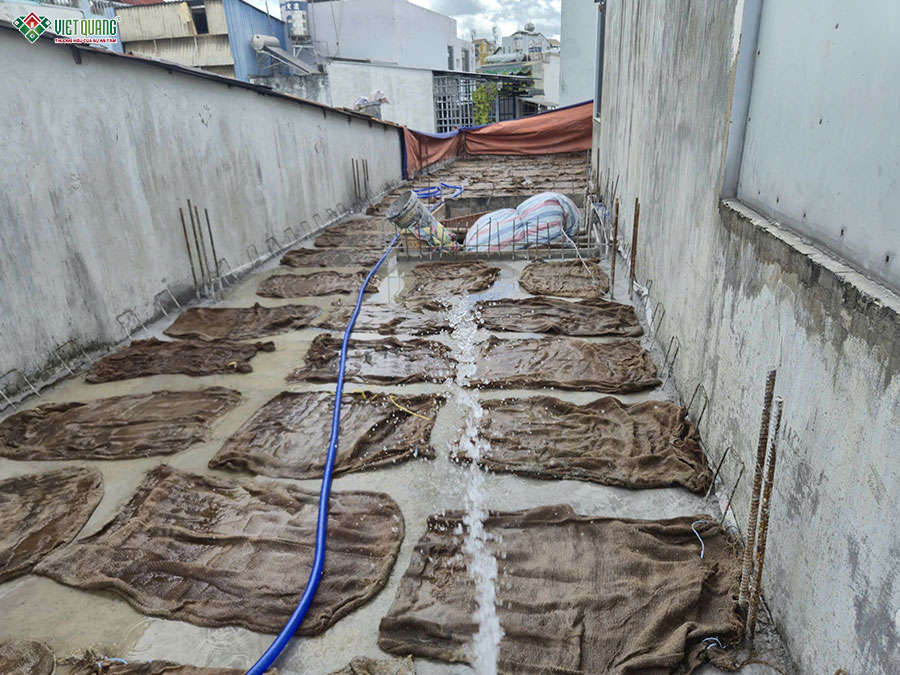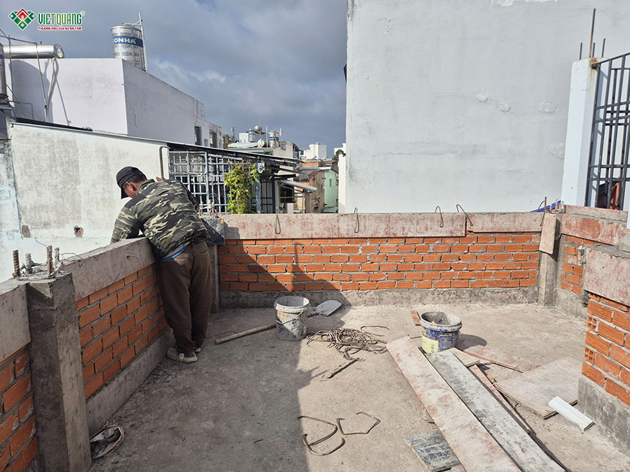 Thi công phần thô sân thượng là bước hoàn thiện cấu trúc cuối cùng của ngôi nhà 3 tầng sân thượng, đồng thời chuẩn bị bề mặt để thi công chống thấm, hoàn thiện mái và các hạng mục kỹ thuật trên cao. Tại khu vực này, đội ngũ Việt Quang Group tiến hành xây tường bao, tường chắn mái bằng gạch theo đúng cao độ thiết kế, đảm bảo an toàn và chịu lực tốt trước các tác động của thời tiết. Các vị trí thép chờ, lan can, ô thông gió hay khu vực đặt bồn nước, máy năng lượng mặt trời đều được bố trí chính xác ngay từ giai đoạn này.