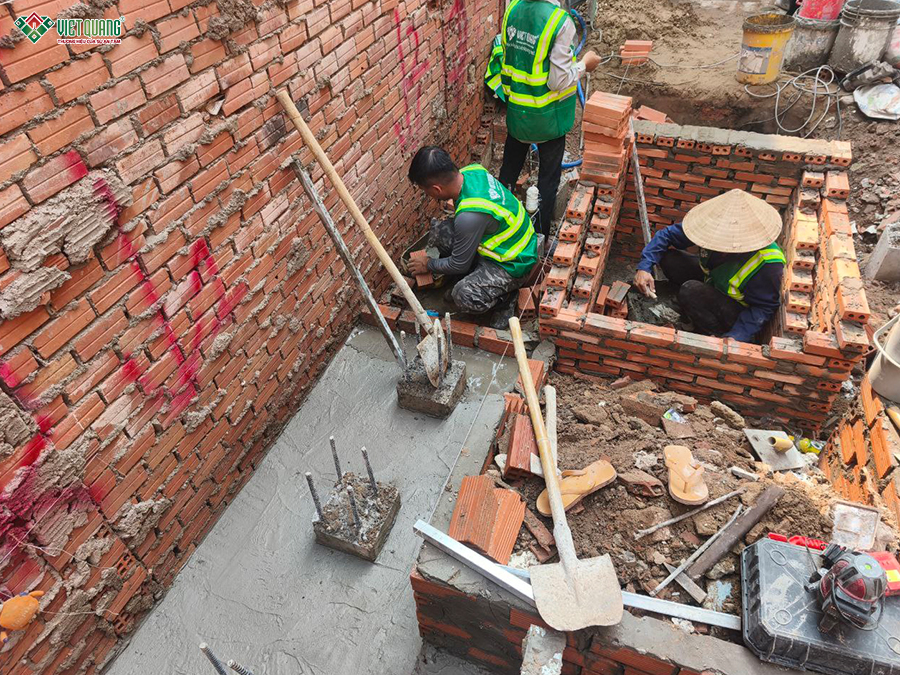 Là ngôi nhà có diện tích nhỏ, phần móng đóng vai trò quan trọng trong việc đảm bảo độ bền và an toàn lâu dài cho công trình. Sau khi phân tích điều kiện địa chất khu đất, phương án thi công móng cọc được đội ngũ kỹ sư Việt Quang Group lựa chọn. Phương án thi công móng cọc nhằm gia cố nền đất, tăng khả năng tải trọng công trình và góp phần giảm tính trạng lún, nứt  trong quá trình sử dụng sau này.