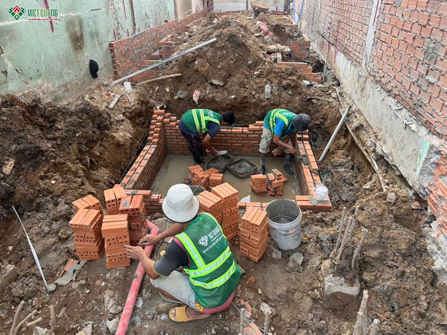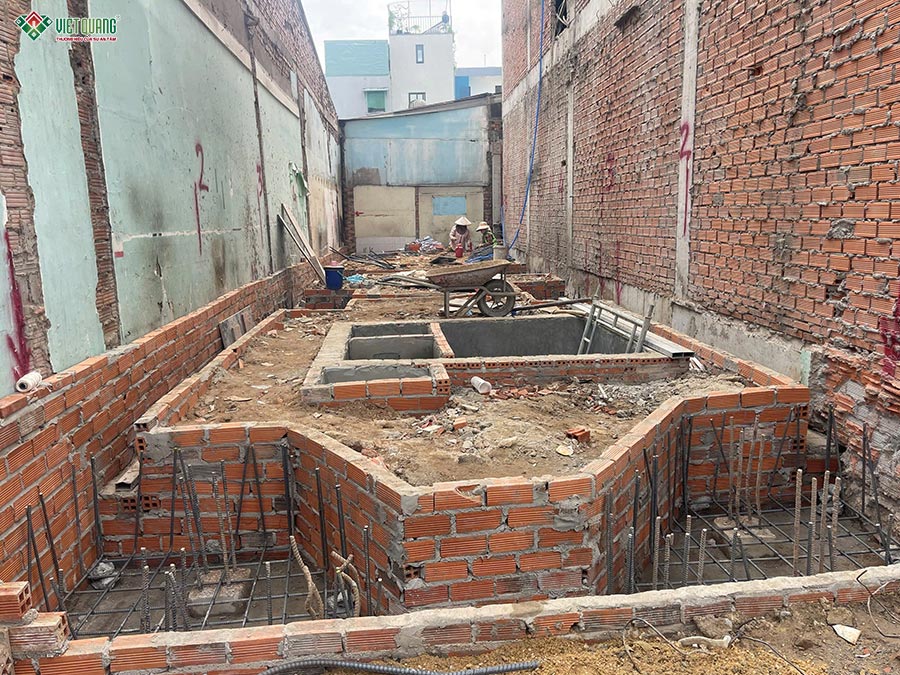 Với đặc thù là nhà phố cao tầng 6 tầng, diện tích 5x18m, công tác thi công móng được Việt Quang Group đặc biệt chú trọng ngay từ giai đoạn đầu. Đội ngũ kỹ sư tiến hành khảo sát địa chất thực tế, đánh giá tải trọng công trình và điều kiện khu vực xây dựng để đưa ra giải pháp móng phù hợp, đảm bảo khả năng chịu lực và độ ổn định lâu dài.