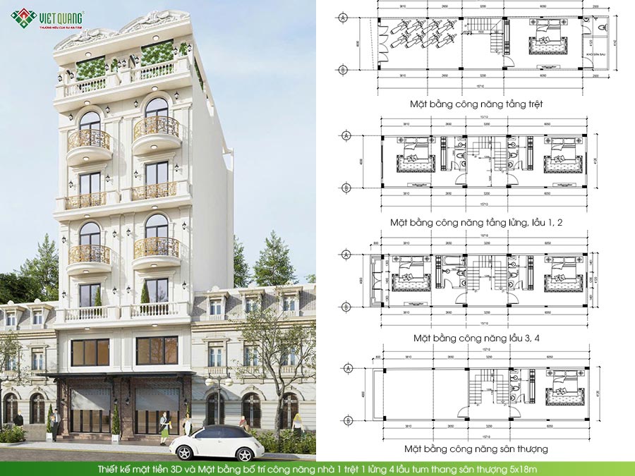 Thiết kế mặt tiền 3D và Mặt bằng bố trí công năng nhà 1 trệt lửng 4 lầu sân thượng 5x18m