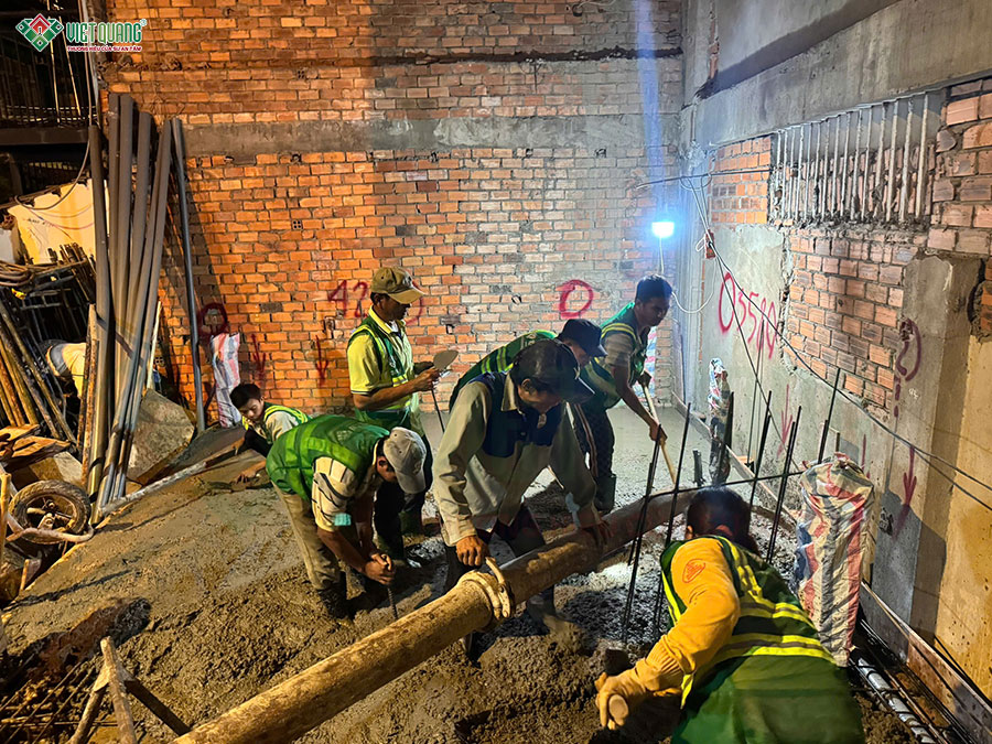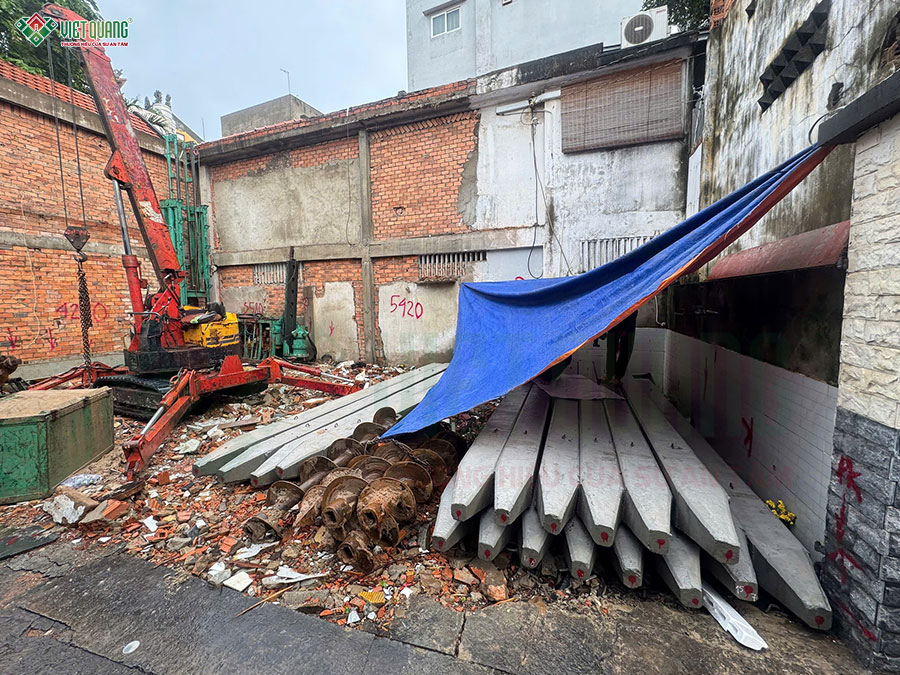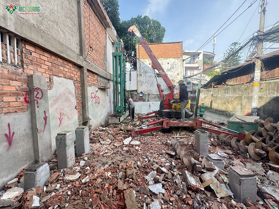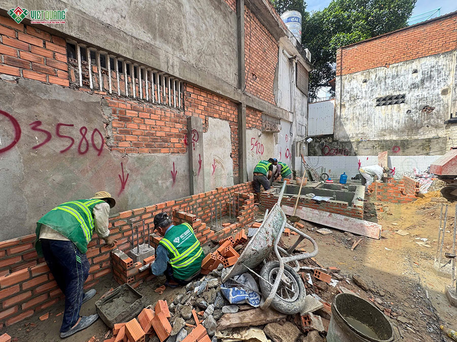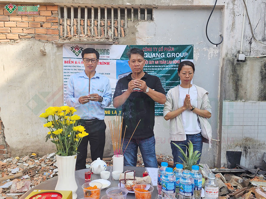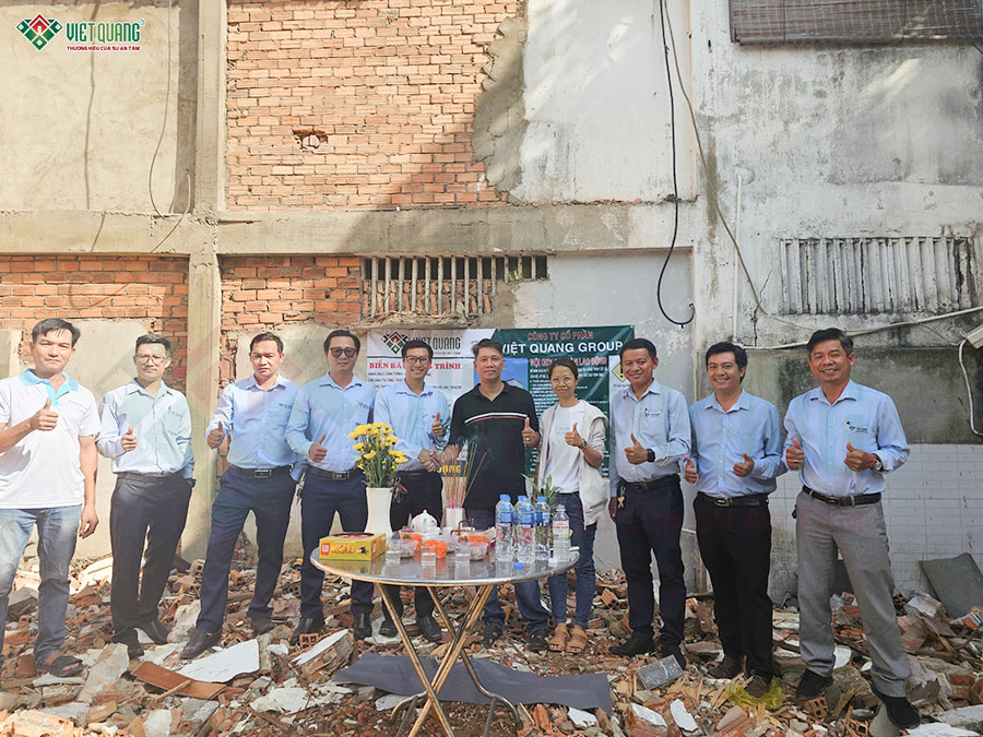 Sau khi hoàn thành các nghi lễ cúng động thổ, đội ngũ nhân sự Việt Quang Group tiến hành tập kết vật tư, chuẩn bị lán trại, dọn mặt bằng,… sẵn sàng bắt đầu quá trình thi công xây dựng trọn gói nhà lô góc 3 tầng.