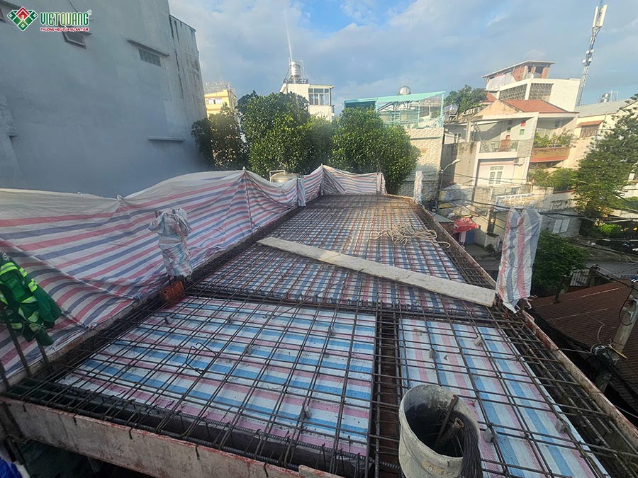 Tiếp tục quá trình thi công xây thô nhà lô góc 3 tầng 5x14m cho gia đình anh Tuấn, đội ngũ nhân công xây dựng Việt Quang Group bước vào giai đoạn thi công các hạng mục: Đổ bê tông sàn mái, xây tường bao sân thượng, thi công xây tường, tô tường. Phần mái được thi công đúng cao độ, đúng độ dốc kỹ thuật theo bản vẽ, đảm bảo khả năng chịu lực, thoát nước tốt và hạn chế tối đa thấm dột trong quá trình sử dụng lâu dài. Công tác lắp dựng cốt thép, ghép cốp pha và đổ bê tông mái được kiểm soát chặt chẽ, tuân thủ nghiêm ngặt tiêu chuẩn kỹ thuật và an toàn thi công.
