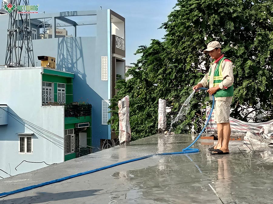 Hình ảnh tưới nước bảo dưỡng bê tông sàn lầu 2