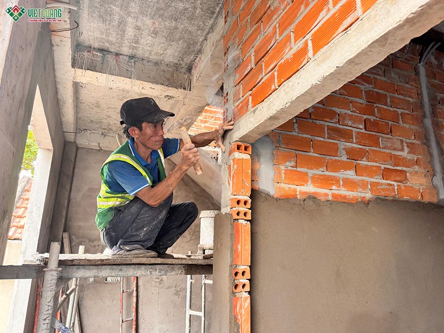 Cũng giống như các tầng lầu trước, giai đoạn xây dựng phần thô lầu 2 đội ngũ kỹ sư Việt Quang Group trực tiếp giám sát từng công đoạn, từ bố trí cốt thép, liên kết dầm cột, đến công tác ghép cốp pha và đổ bê tông sàn, nhằm hạn chế tối đa sai số kỹ thuật. Các mảng tường bao, tường ngăn phòng được xây dựng thẳng, đều mạch, đúng cao độ thiết kế, đồng thời kiểm soát chặt chẽ vị trí cửa sổ, ban công và các khoảng lấy sáng thông gió tự nhiên. Việc chừa sẵn các đường ống kỹ thuật âm tường, âm sàn được thực hiện cẩn trọng, khoa học, giúp thuận lợi cho giai đoạn thi công hoàn thiện, hạn chế đục phá và đảm bảo tính thẩm mỹ lâu dài cho ngôi nhà.