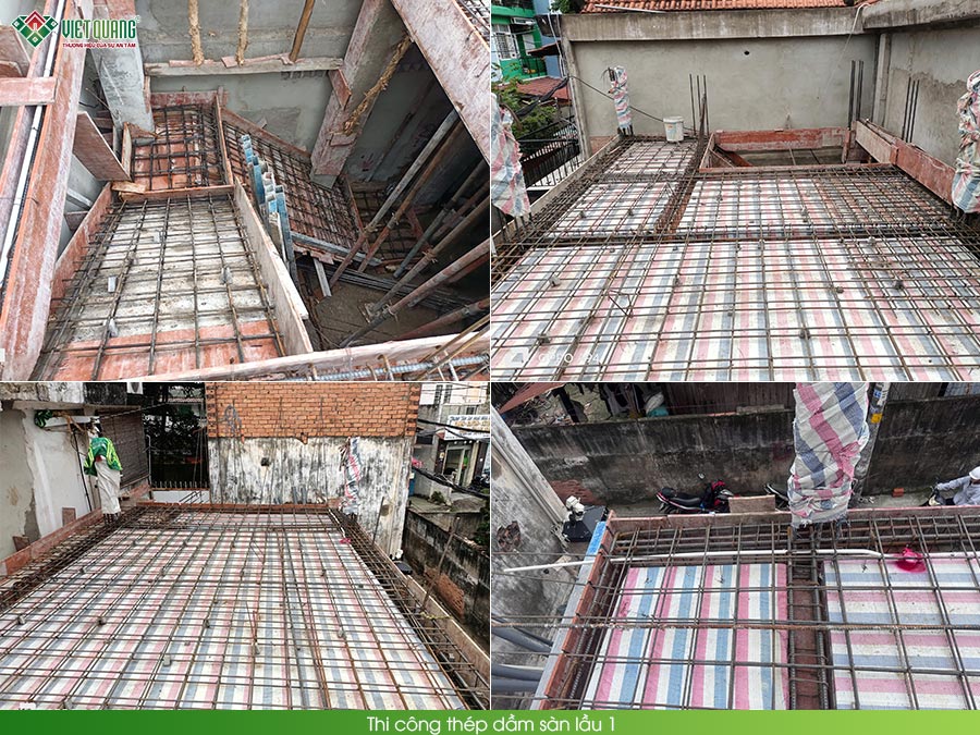 Hoàn thành thi công xây dựng phần thô tầng trệt nền tảng “khung xương” nhà lô góc 3 tầng, đội ngũ nhân công xây dựng Việt Quang Group tiếp tục triển khai các hạng mục thi công xây thô lầu 1. Với đặc thù là nhà lô góc 2 mặt thoáng, quá trình thi công phần thô lầu 1 được đội ngũ kỹ sư Việt Quang Group giám sát chặt chẽ từng công đoạn nhằm đảm bảo kết cấu chịu lực vững chắc, độ chính xác cao và an toàn tuyệt đối.