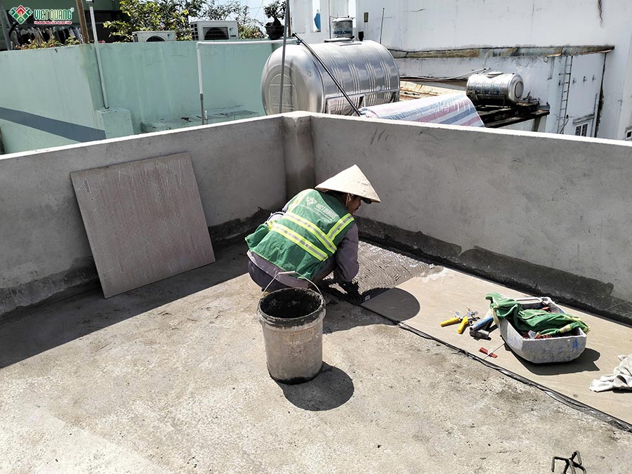 Hình ảnh thợ thi công lát gạch sân thượng