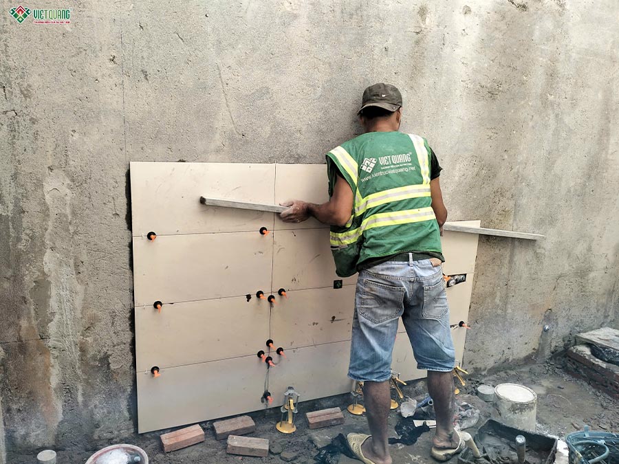Hình ảnh thợ thi công ốp gạch tường