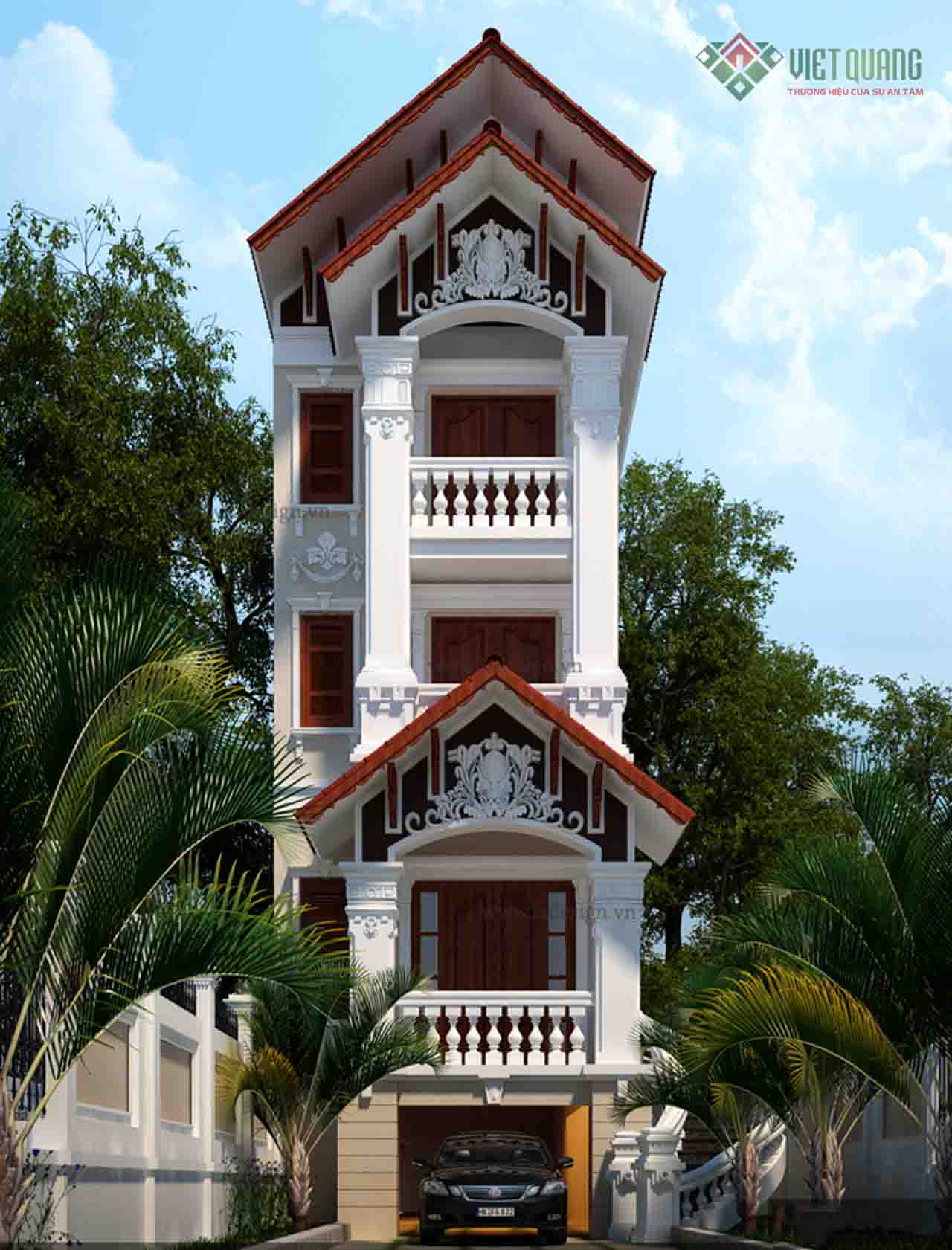 Việt Quang Group giới thiệu đến quý khách mẫu thiết kế nhà phố tân cổ điển 4 tầng – 06. Đây là mẫu thiết kế nhà phố 4 tầng mái thái lợp ngói kiến trúc tân cổ điển diện tích 5x15m