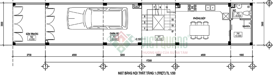 c. Bản vẽ thiết kế mặt bằng lầu 1 nhà phố 5 tầng 3.5x17m