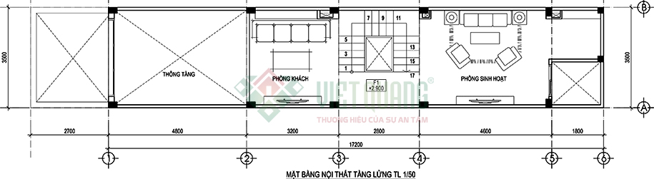 Diện tích tầng lửng là 3.5×12.4m được bố trí phòng khách và 01 phòng sinh hoạt chung.
