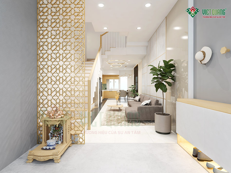 Thiết kế nội thất sử dụng phong cách hiện đại, hai tone màu chủ đạo của ngôi nhà là màu trắng và màu xám, điểm nhấn của không gian phòng khách chính là những mãng màu vàng gold của những nội thất gỗ như tay nắm cầu thang, tủ bếp, vách ngăn cầu thang phía sau bàn thờ ông địa…