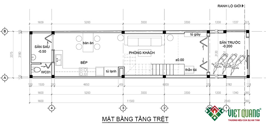 Mặt bằng tầng trệt nhà phố 4 tầng 1 lửng 3.4x15.5m