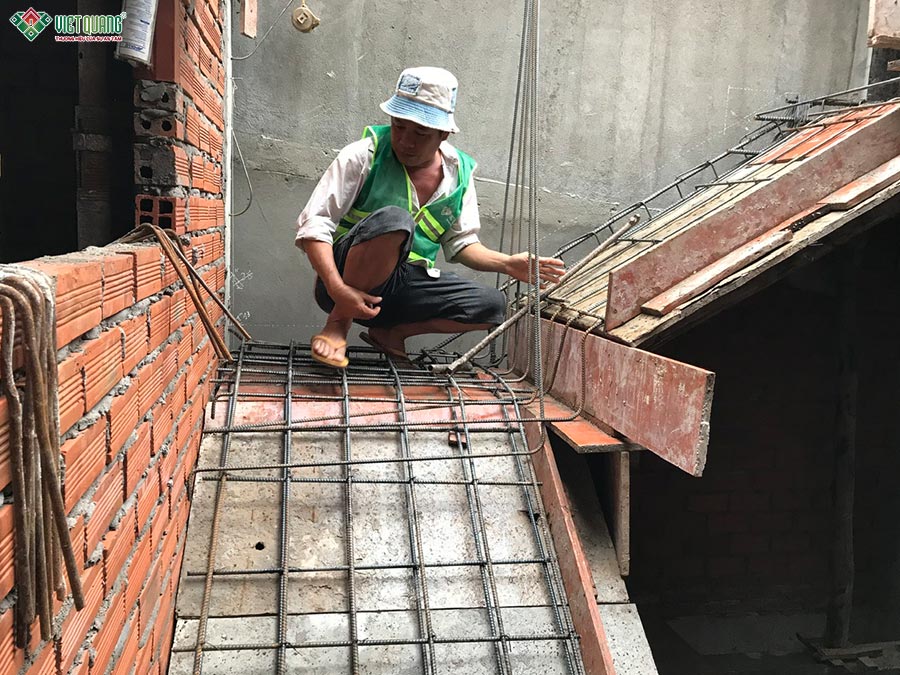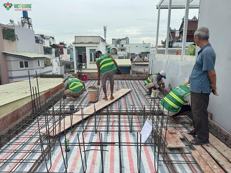 Sau khi hoàn tất phần móng, đội thi công Việt Quang Group bước qua giai đoạn thi công phần thô tầng trệt: Tiến hành dựng cột, đổ dầm sàn tầng trệt. Hệ thống cốp pha, giàn giáo được lắp đặt đúng tiêu chuẩn an toàn. Cốt thép được ràng buộc chặt chẽ, đảm bảo đúng chủng loại và tiết diện theo bản vẽ kết cấu. Phần sàn tầng trệt sử dụng bê tông tươi thương phẩm, được kiểm định mác bê tông trước khi đổ. Sau 3 ngày, bê tông được bảo dưỡng kỹ càng để đạt cường độ tối đa. Tầng trệt hoàn thiện giúp định hình không gian tổng thể nơi đặt phòng khách và bếp ăn chính, là “trái tim” của ngôi nhà.