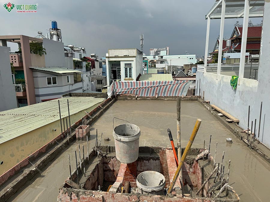 Lầu 2 được đội ngũ Việt Quang Group tiếp tục triển khai thi công sàn, cột, dầm, tường bao và cầu thang nối tầng. Toàn bộ kết cấu bê tông được đổ đồng nhất để đảm bảo sự liên kết bền vững.