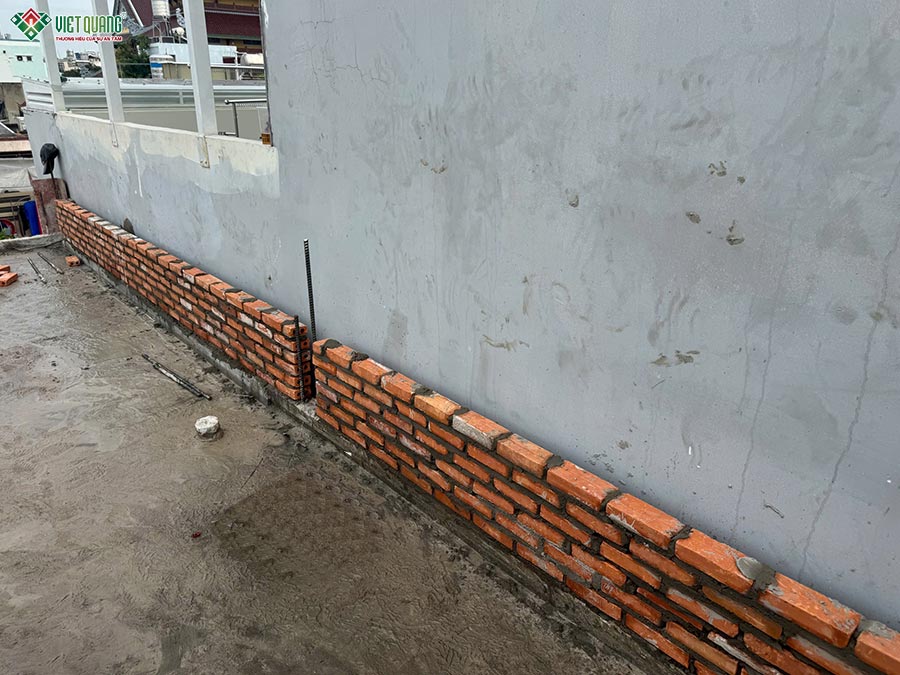 Phần lan can ban công được đổ bê tông cốt thép liền khối, giúp tăng độ cứng vững. Song song, phần tường bao được xây bằng gạch ống 8x8x18, mạch vữa đều, thẳng, đúng kỹ thuật.